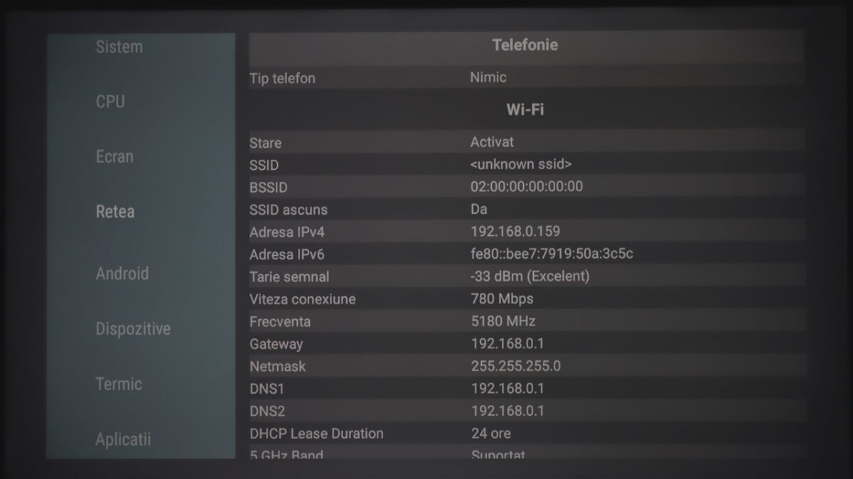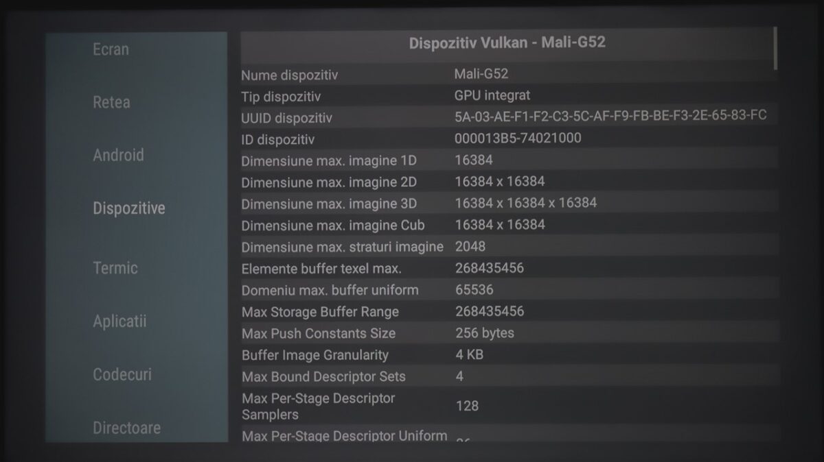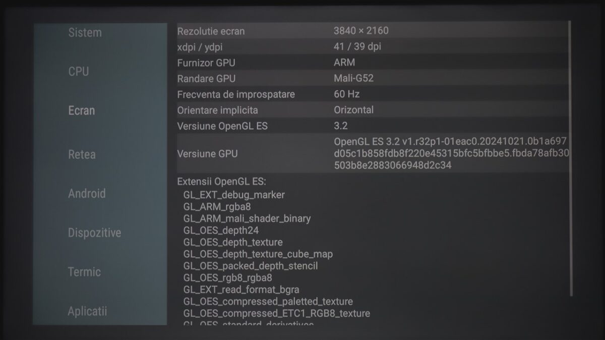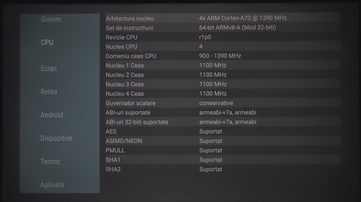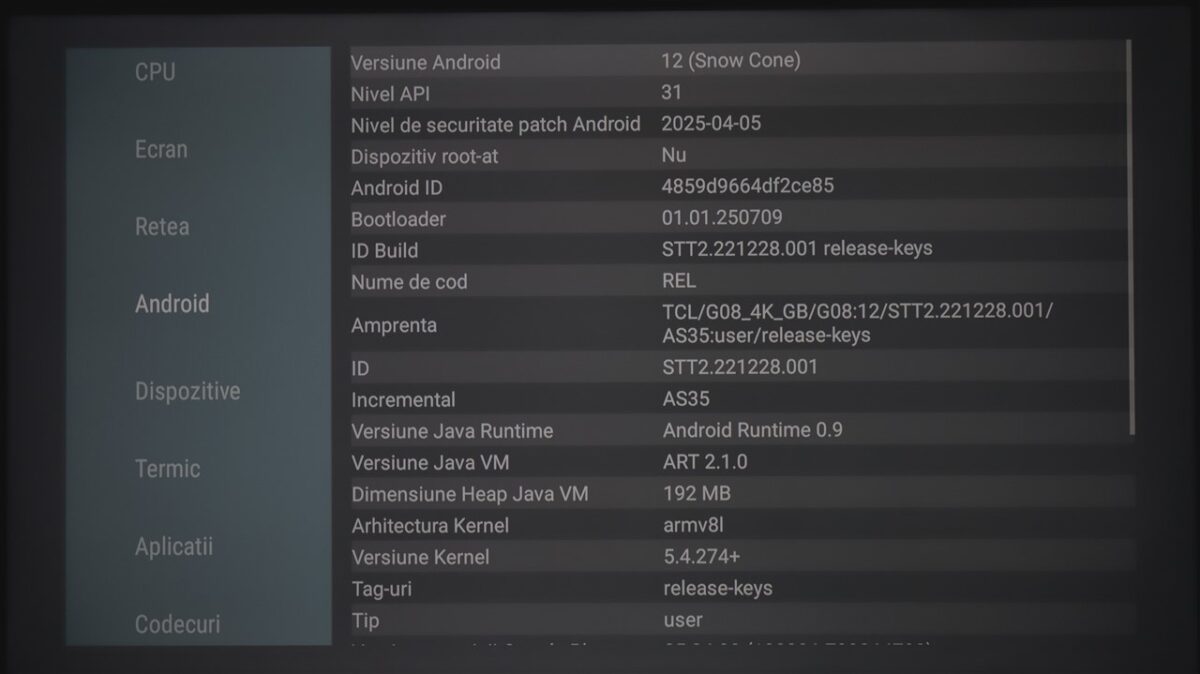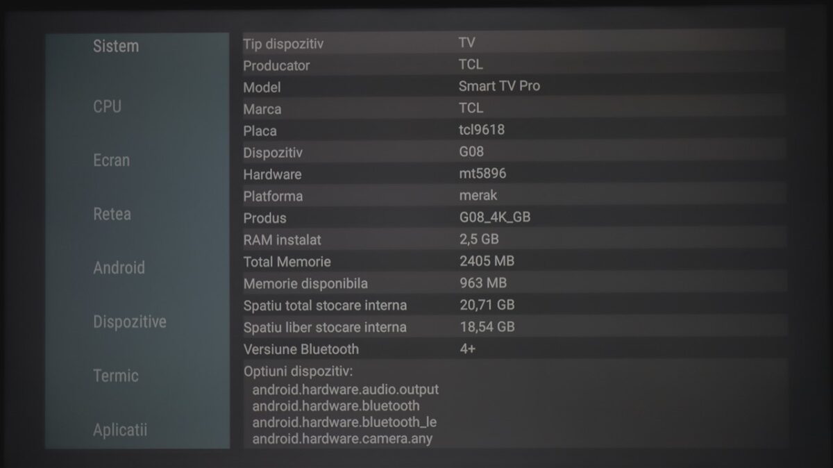 Din punct de vedere al specificațiilor ce țin de ansamblul hardware care permite rularea sistemului de operare Google TV 12, TCL nu dă informații oficiale, dar am instalat AIDA64 pe televizor, iar aplicația a scos la iveală datele de mai jos.