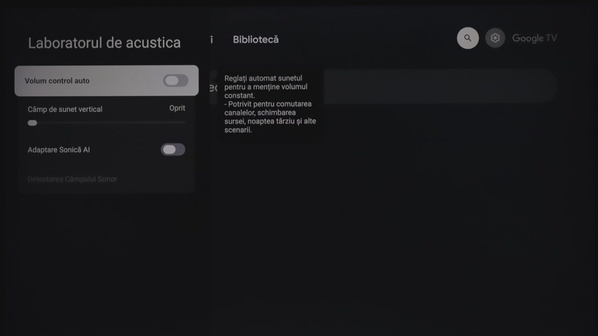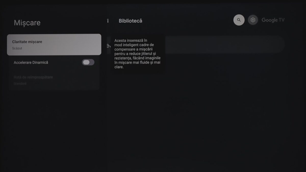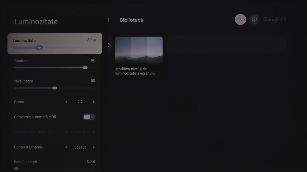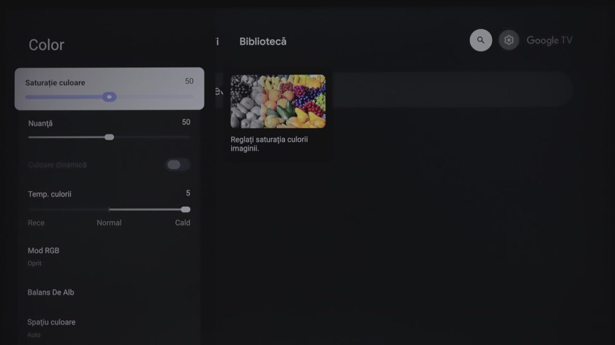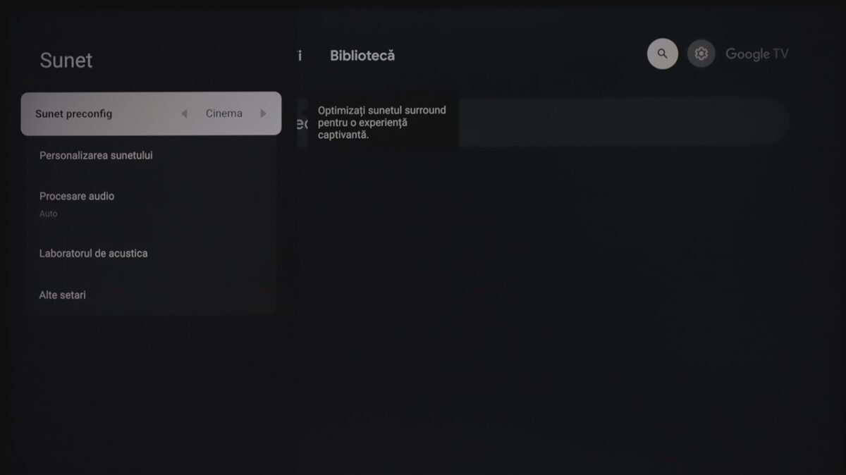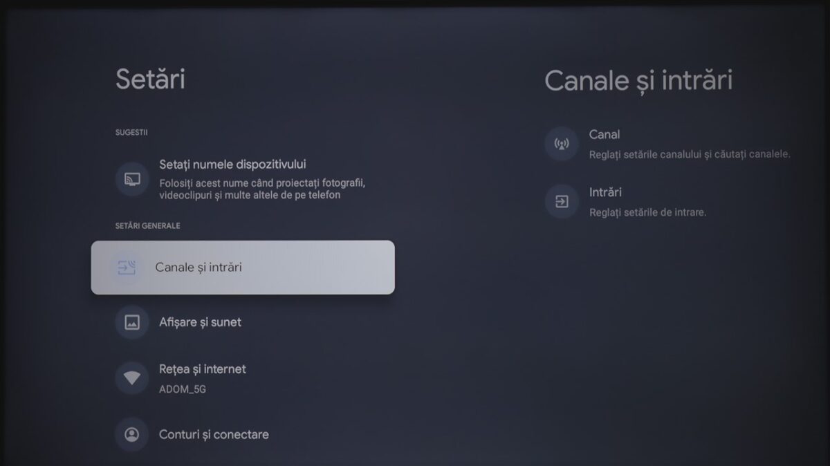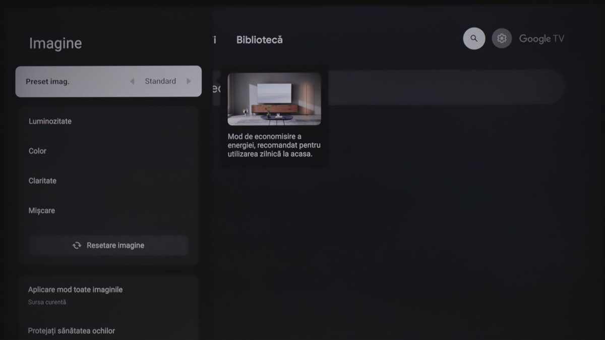 Totodată, la fel ca și la celelalte dispozitive cu Google TV pe care le-am mai testat, sistemul de operare integrează practic și zona de setări ale televizorului. Mă refer la cele de imagine, sunet, conectivitate ș.a.m.d., care sunt însă diferite de la dispozitiv la dispozitiv, meniurile și submeniurile conțin setări și reglaje diferite în funcție de ce poate oferi fiecare hardware.