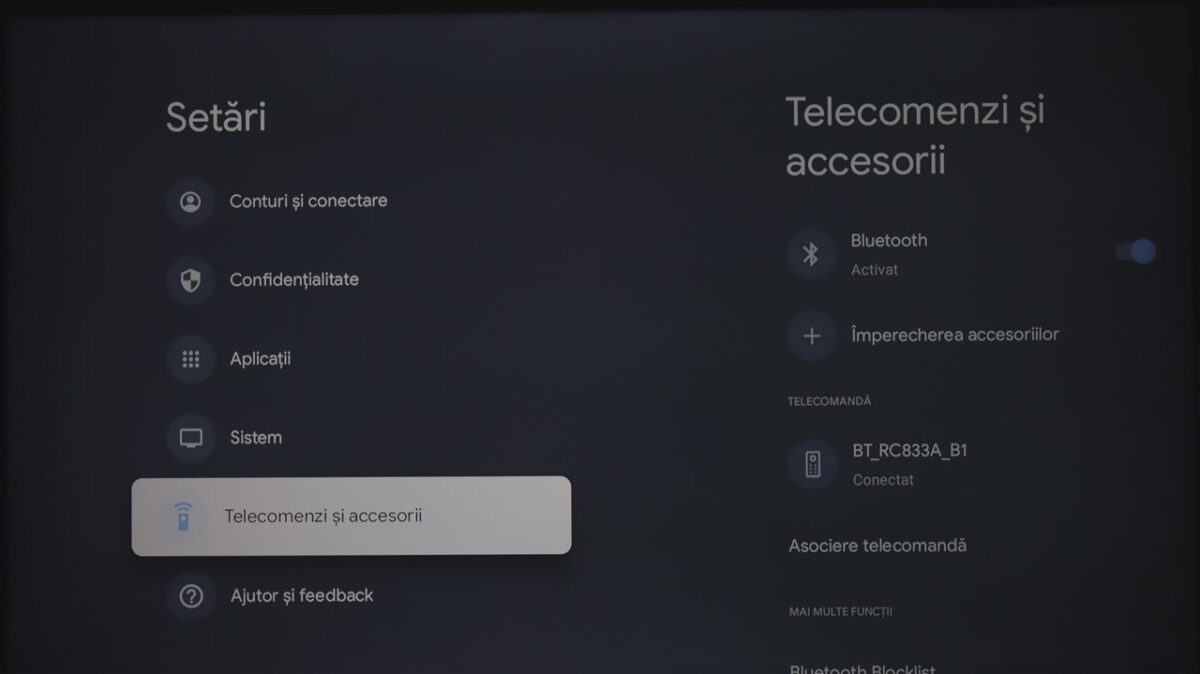 În fine, dacă poți să treci peste aceste detalii (și vei putea foarte rapid, cel puțin aceasta a fost experiența mea), descoperi o telecomandă completă, căreia nu-i lipsește nimic. Este una care are atât modul IR pentru comenzi, dar care se conectează și prin Bluetooth la TV, pentru a beneficia la maxim de toate funcțiile sale, iar aici mă refer în special la microfonul integrat, care permite interacțiune vocală cu asistentul Google.