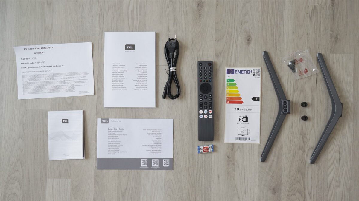 Am primit unitatea de test în cutia de retail sigilată, în care, pe lângă televizor, mai era telecomanda cu baterii compatibile, cele două picioare cu câte două șuruburi pentru fiecare, cablul de alimentare și mai multe pliante, cu diferite informații.