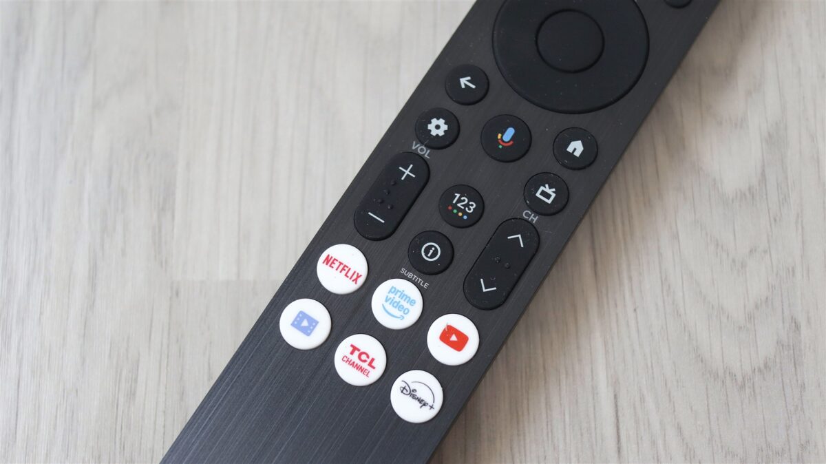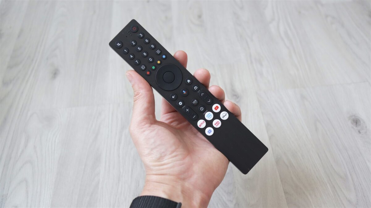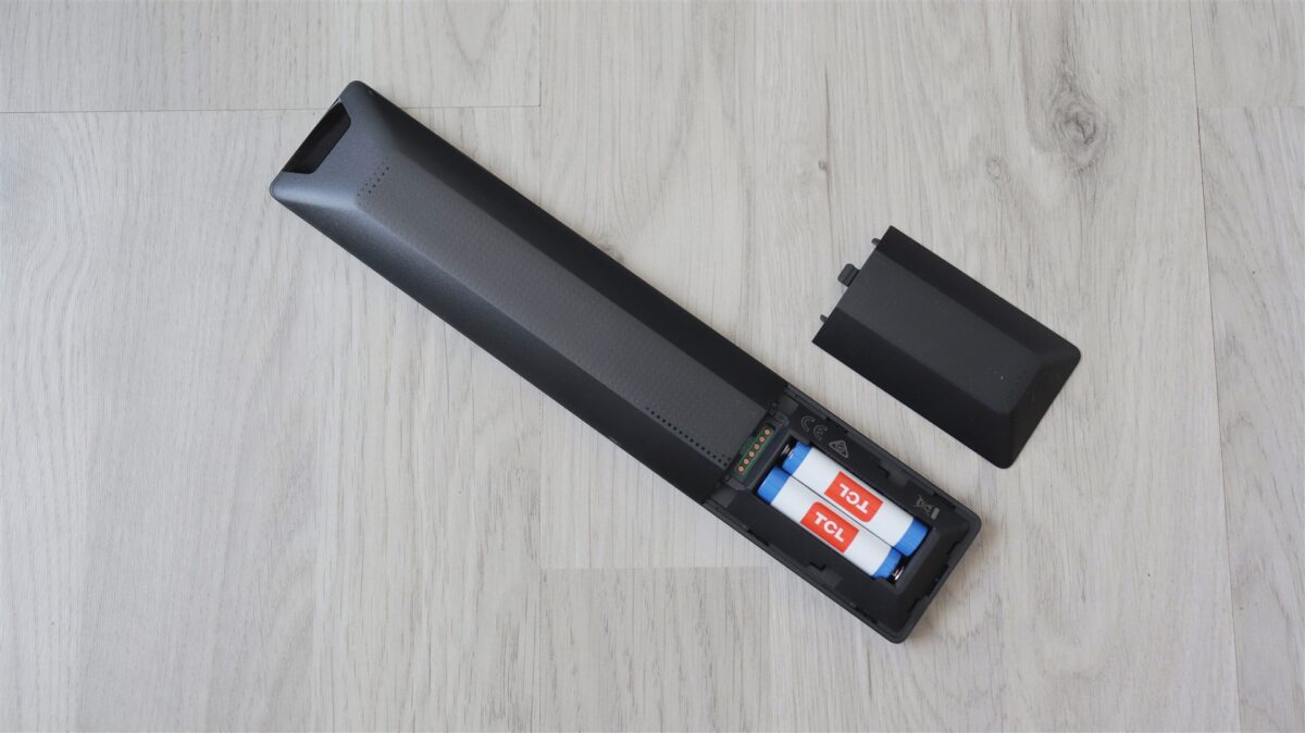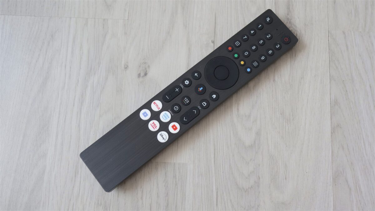 Dacă până aici mai nimic nu a lăsat altă impresie decât de produs cu reale valențe premium, când iei primul contact cu telecomanda televizorului TCL QLED 55P8K ai o senzație de… se putea mai bine. Asta fiindcă designul este unul ca de telecomandă clasică, nu de smart TV și în niciun caz de unul din 2025, iar la construcție nu avem decât plastic la tot exteriorul. Este adevărat că asta face ca telecomanda să fie ușoară, iar la cât de îngustă este să se și așeze bine în mână. Pe de altă parte, faptul că este foarte lungă face ca unele butoane să nu poată fi ajunse cel mai ușor.