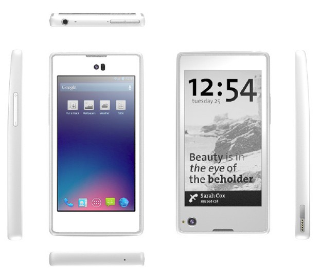 Display: – LCD de 4.3 inch, rezoluție de 720 X 1,280 pixeli + protecție Gorilla Glass pe față și display E Ink de 4.3 inch de 200 dpi + protecție Gorilla Glass pe spate