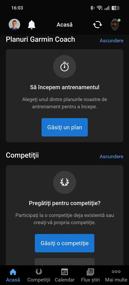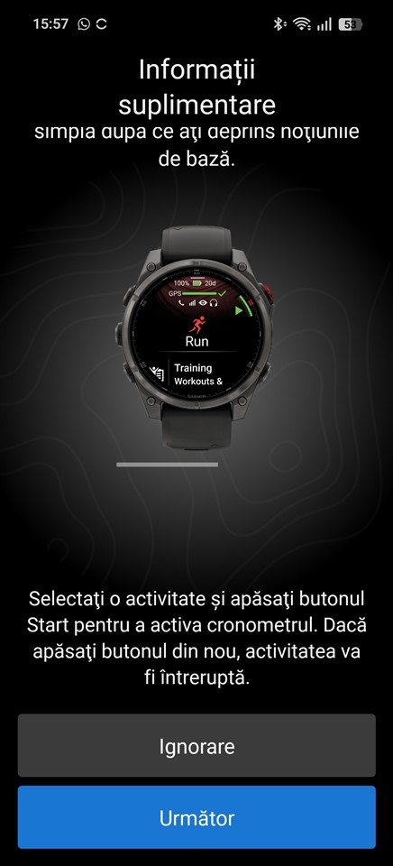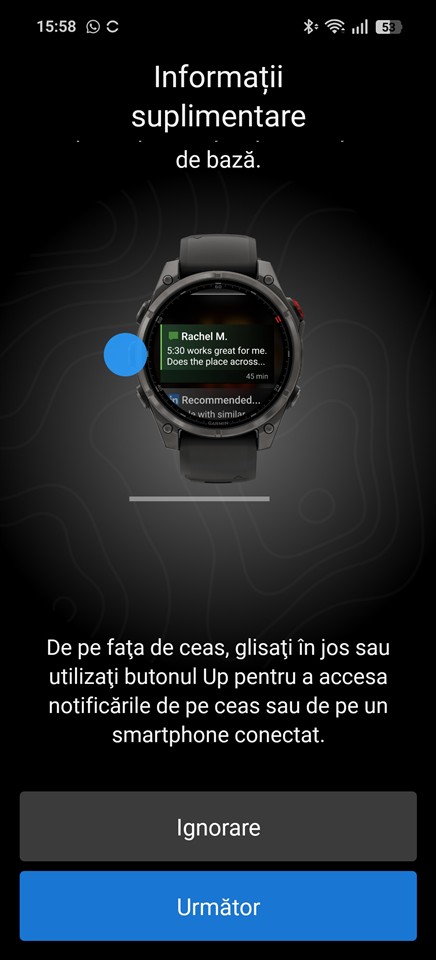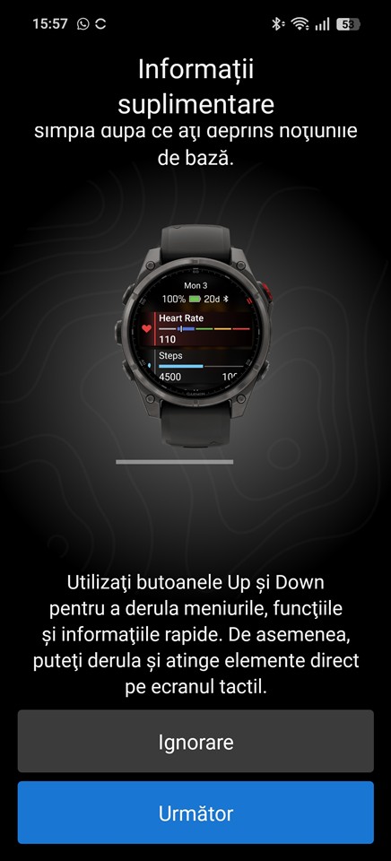 Apoi, pe smartphone ai nevoie de aplicația Garmin Connect pentru a împerechea ceasul și a face cea mai mare parte a setărilor ce țin de cont, dar și pentru ceas și multe altele.