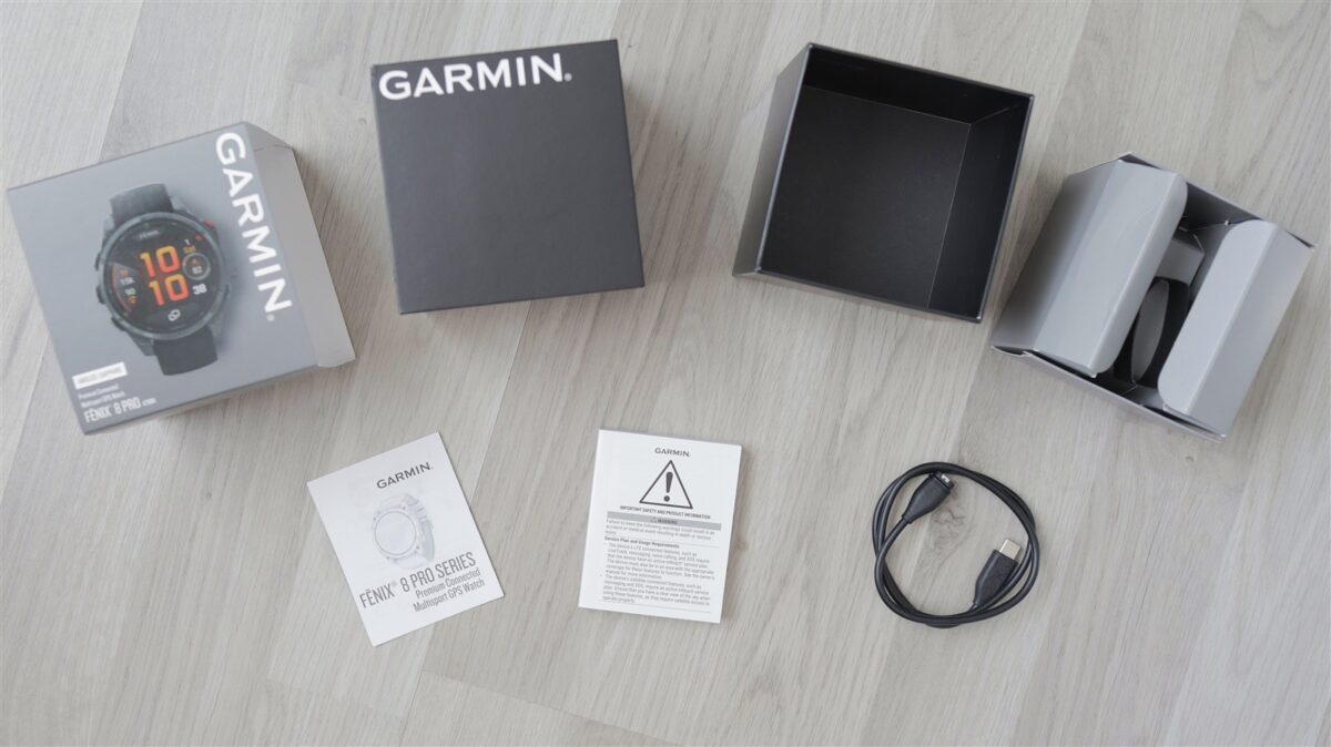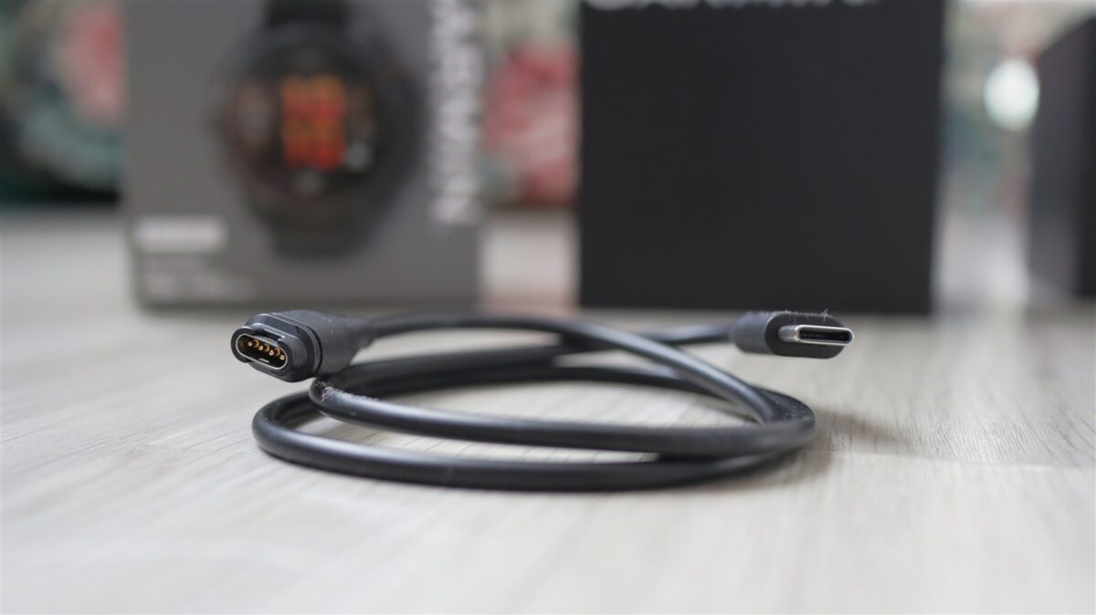 Am primit unitatea de test în cutia de retail sigilată, în care sunt alte fel de fel de cutiuțe, în care până la urmă nu sunt prea multe accesorii. Pe lângă ceasul în sine, mai avem doar cablul de încărcare cu ștecher proprietar Garmin la un capăt și mufă USB-C la celălalt, un mic ghid de pornire rapidă și o cărțulie, să o numesc, cu multe informații legale, de reglementare și siguranță.