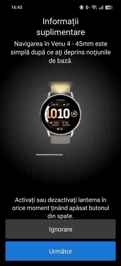 Un element care se regăsește în ultimul timp pe mai toate noile ceasuri Garmin este lanterna. Nu lipsește nici de pe Venu 4 și aduce și aici un LED alb care poate lumina în patru trepte de putere, dar și un LED roșu, care se aprinde într-o singură treaptă. Pe alb, nici la maxim nu aș spune că generează o lumină puternică, poate doar de nivel mediu. Utilă în întuneric complet, dar care nu poate lumina suficient la mai mult de 2 – 3 metri, poate nici atât.