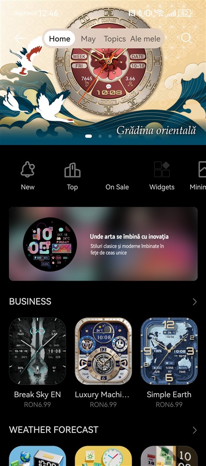 Aici nu am găsit detalii despre procesor, memorie sau spațiu de stocare, iar sistemul de operare este deja binecunoscut în ecosistemul de dispozitive purtabile Huawei. Avem un Harmony OS 5.1 care este bine optimizat, ușor de parcurs și plin de opțiuni, poți face o personalizare corectă pentru ceea ce este afișat pe ecranele de start, prin care treci cu swipe lateral de la fața de ceas principală. Apropo de fețe de ceas, sunt câteva exclusiv disponibile pentru Huawei Watch Fit 4 Pro, mare parte dintre ele permit o personalizare mai aprofundată, iar în aplicația de mobil găsești alte sute, chiar mii de fețe suplimentare.