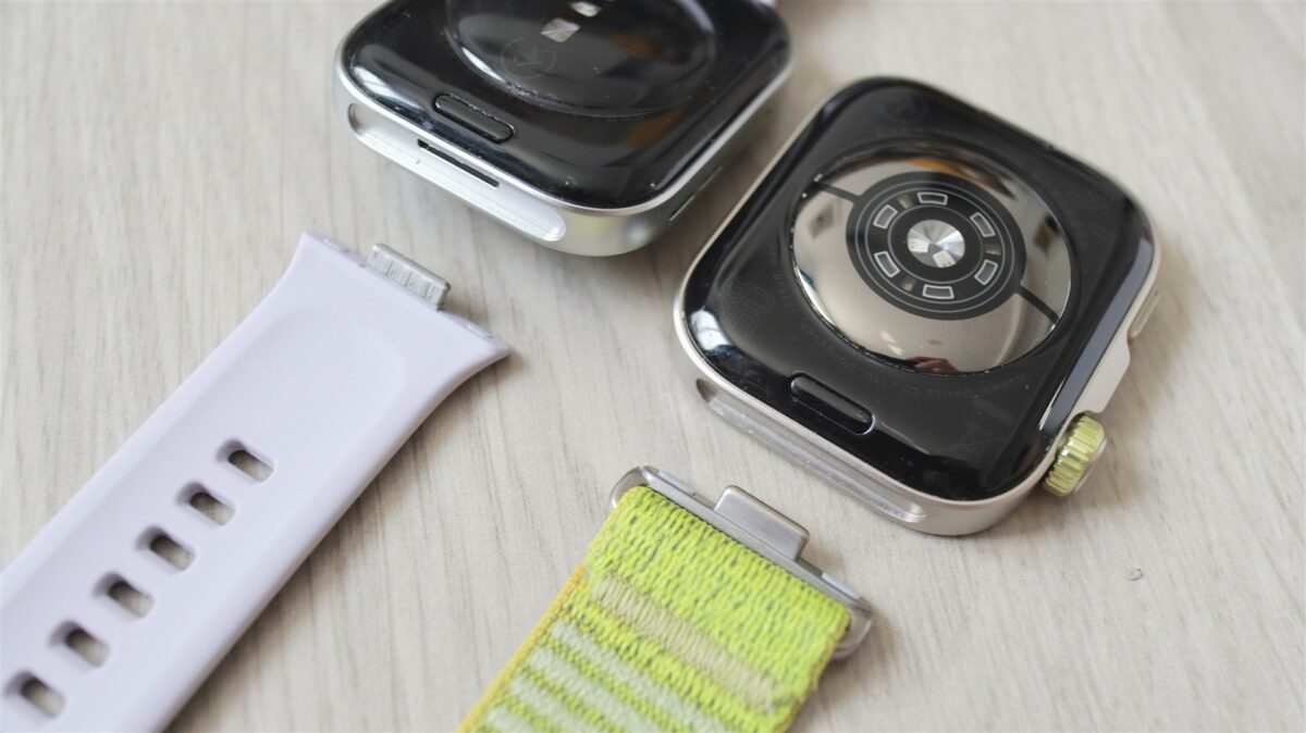 | Dimensiuni | 44.5 x 40 x 9.3 mm (doar corp, fără curea, grosime excluzând zona senzorului) | 43 x 38 x 9.5 mm (doar corp, fără curea, grosime excluzând zona senzorului) |