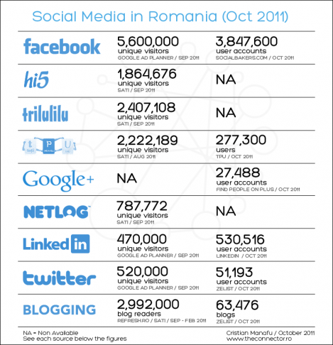 Facebook este vedeta reţelelor sociale pe plan local şi până la sfârşitul anului s-ar putea să atingă milestone-ul de 4 milioane conturi. Dintre site-urile autohtone iese în evidenţă trilulilu.ro – video sharing românesc în genul YouTube.com. Twitter în ţara noastră este departe de succesul înregistrat în SUA cu doar puţin peste 50.000 de conturi şi multe dintre ele inactive.