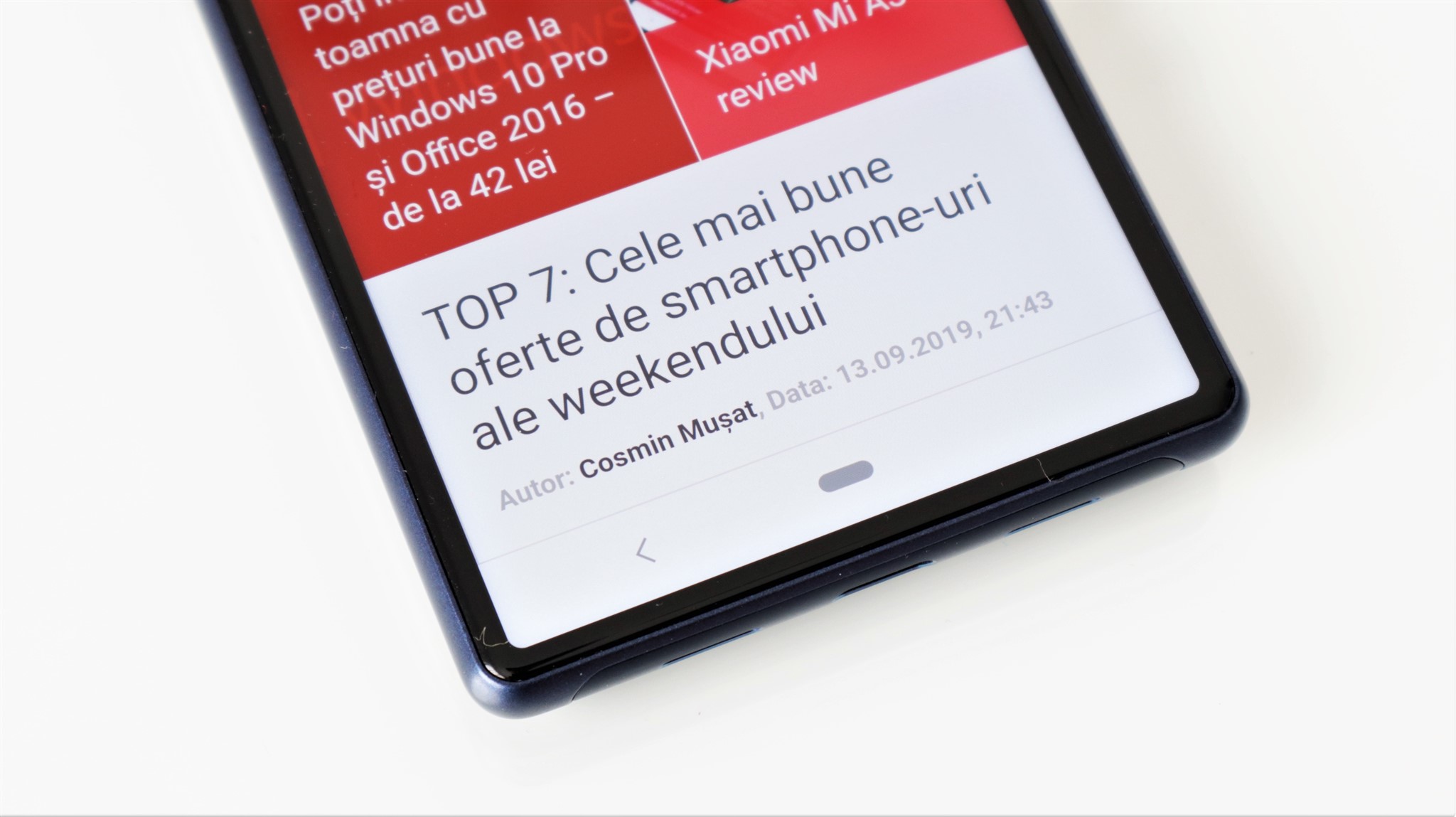 Chiar mi-a plăcut cum s-a prezentat Sony Xperia 10 la capitolul design, însă există și o parte deloc bună. Butoanele pentru reglarea volumului și cel Power, toate amplasate pe latura din dreapta și despărțite de senzorul de amprentă, sunt la același nivel cu carcasa. Poate doar un pic de tot, dar extrem de puțin ieșite în relief și în consecință foarte greu de găsit. Nici după mai bine de o lună de utilizare nu pot să spun că am găsit imediat butonul Power pe Sony Xperia 10. În mod clar un element ce dă bine la design, dar care deranjează în fiecare zi.