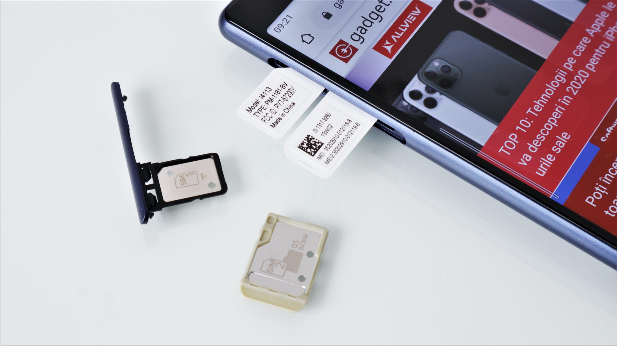 Nu-i lipsește mai nimc aici lui Sony Xperia 10. Avem două sloturi nano sim ce se ascund în spatele unui sertar dublu, pentru deschiderea căruia nu este nevoie de vreun instrument special. Doar tragi cu unghia și ai acces imediat la sloturile sim. În locul sim 2 poți insera un card microSD de până la 1 TB.