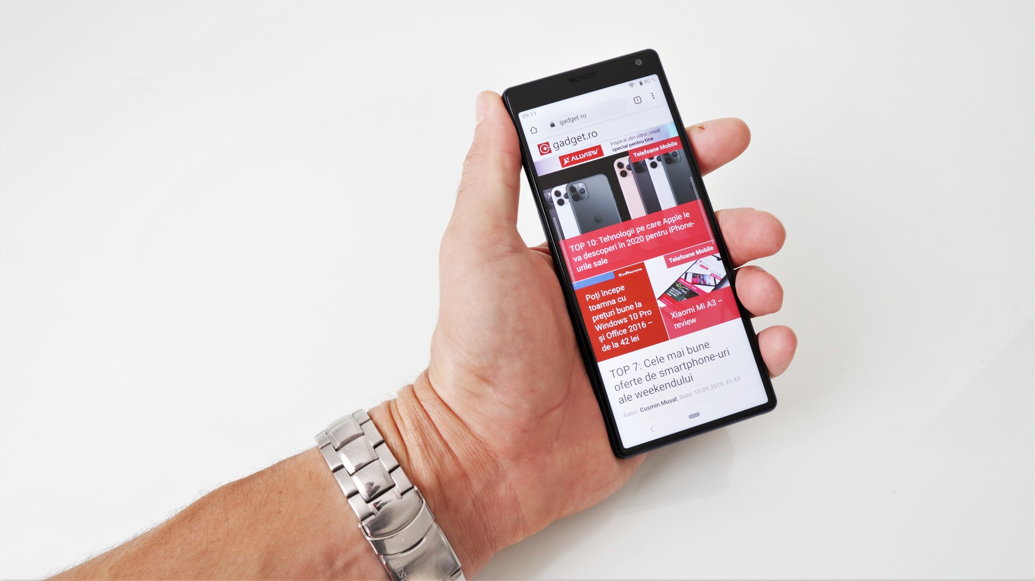 Sony Xperia 10 a fost la momentul lansării unul dintre primele smartphone-uri ce adopta un ecran cu raport ultra-wide de 21:9. Asta face ca la primul contact cu acest telefon să nu vrei neapărat să aprinzi ecranul, să rulezi aplicații sau altceva de gen, ci doar să întorci terminalul pe toate părțile.