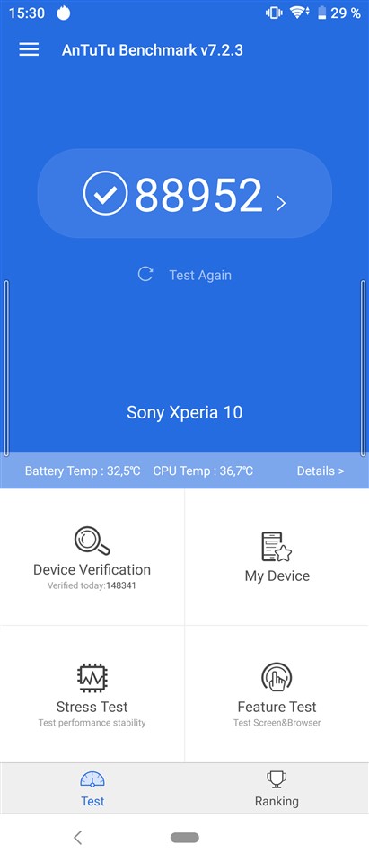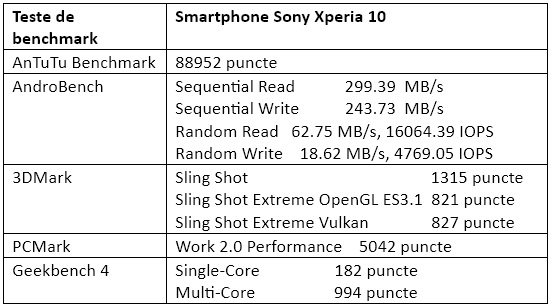 Aici se poate observa în mod evident cât de slab echipat este acest smartphone. Un terminal care costă cât Sony Xperia 10 nu poate veni în 2019 cu mai puțin de 90.000 de puncte în AnTuTu. Știu că rezultatele testelor de benchmark nu reprezintă neapărat o validare a experienței de utilizare, dar oferă date destul de clare despre nivelul puterii de procesare și despre performanța brută, până la urmă.