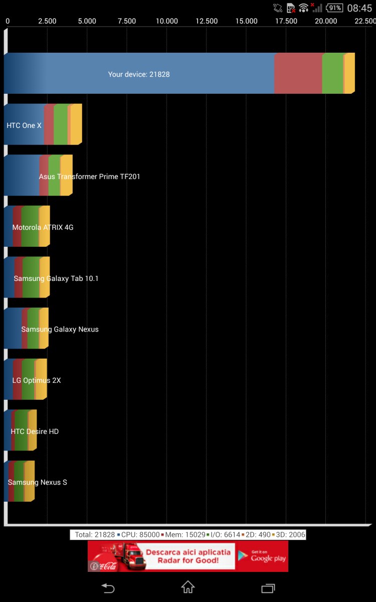 Bateria de 4500 mAh se descurcă decent, iar în stabilirea autonomiei contează, ca de obicei, modul de utilizare. Cu luminozitatea la 50%, internet, browsing, teste de benchmark, redat de clipuri pe YouTube s-a dus spre 7 – 8 ore de folosire aproape continuă, o valoare respectabilă având în vedere ansamblul hardware, display-ul cu rezoluție 1920×1200 pixeli.