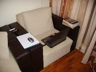 Inspirat de Inka şi al său loc de relaxare am postat şi eu două poze sugestive. În general stau la birou şi “studiez” blogosfera şi, mai degrabă, netul în general. A doua variantă este legată de o altă activitate plăcută mie – cititul cărţilor. Nu ştiu ce m-aş face fără conexiunea la internet( centrul meu de entertainment în timpul liber, în mare parte). Televizorul nu mai este de mult o alternativă viabilă de culturalizare sau măcăr prezentare a ceva ce să se dovedească util. Aş rămâne cu cărţile( până la urmă m-aş obişnui).