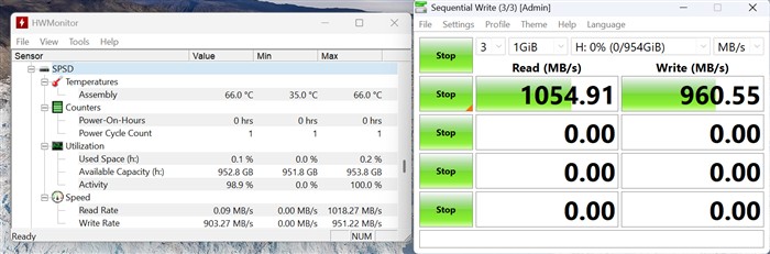 Totodată, am încercat să supun la mare stres SSD-ul și asta timp de câteva minute bune continuu. Temperaturile interne au ajuns la un maxim de 66 grade Celsius, ceea ce nu mi se pare exagerat, având în vedere că sarcina a fost de 100% pentru mai bine de 10 minute continuu, dar altceva contează mai tare, anume că nici când temperaturile interne au ajuns la cele maxime menționate, performanța nu a avut deloc de suferit.