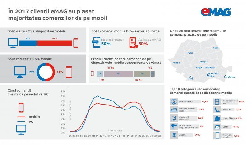 Astfel 51% dintre comenzile din 2017 au fost plasate de pe smartphone-uri şi tablete, în timp ce restul de 49% de pe PC. Dacă ne referim la numărul de vizite pe site, distanţa este şi mai mare: 64% din vizite vin de pe platformele mobile, în timp ce 36% provin de pe PC-uri. 2017 a fost şi primul an în care traficul provenit de pe dispozitivele mobile a trecut lunar pragul de 60%.