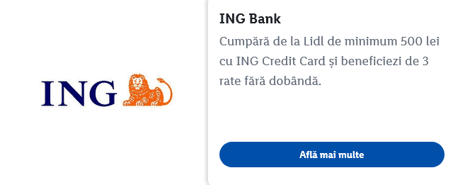 - ING – ai 3 rate fără dobândă la achiziţii de minim 500 lei;