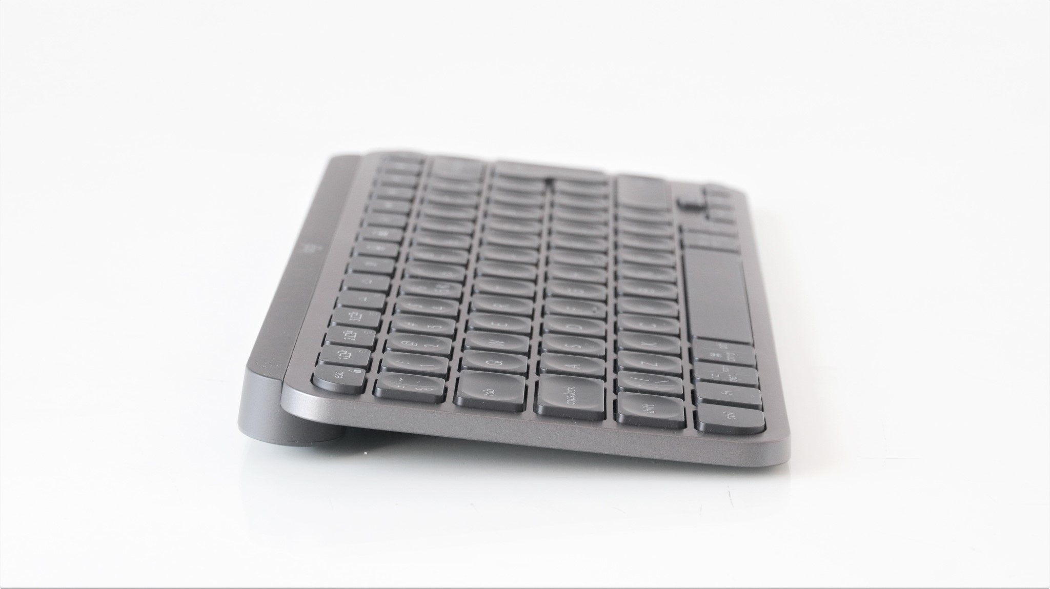 Din păcate, tastatura Logitech MX Keys Mini nu aduce reglaj al înclinării. Nu poți alege un alt unghi față de cel de câteva grade ce se creează prin segmentul unde, cel mai probabil, se află integrat acumulatorul.