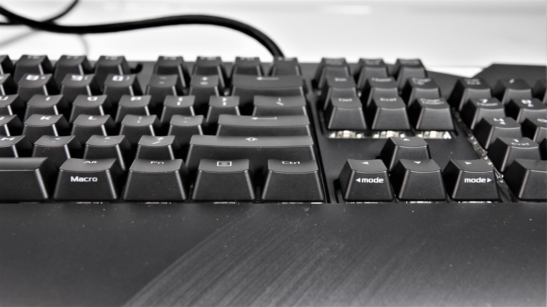 Cablul este foarte gros, în comparație cu orice altă tastatură cu care am mai luat contact, și este îmbrăcat în plasă textilă. Pare extrem de rezistent, iar grosimea mare se datorează faptului că spre capăt se desparte în două porturi USB: primul este cel dedicat funcționării tastaturii, al doilea activează portul USB de pe tastatură, fiind unul de tip pass through.