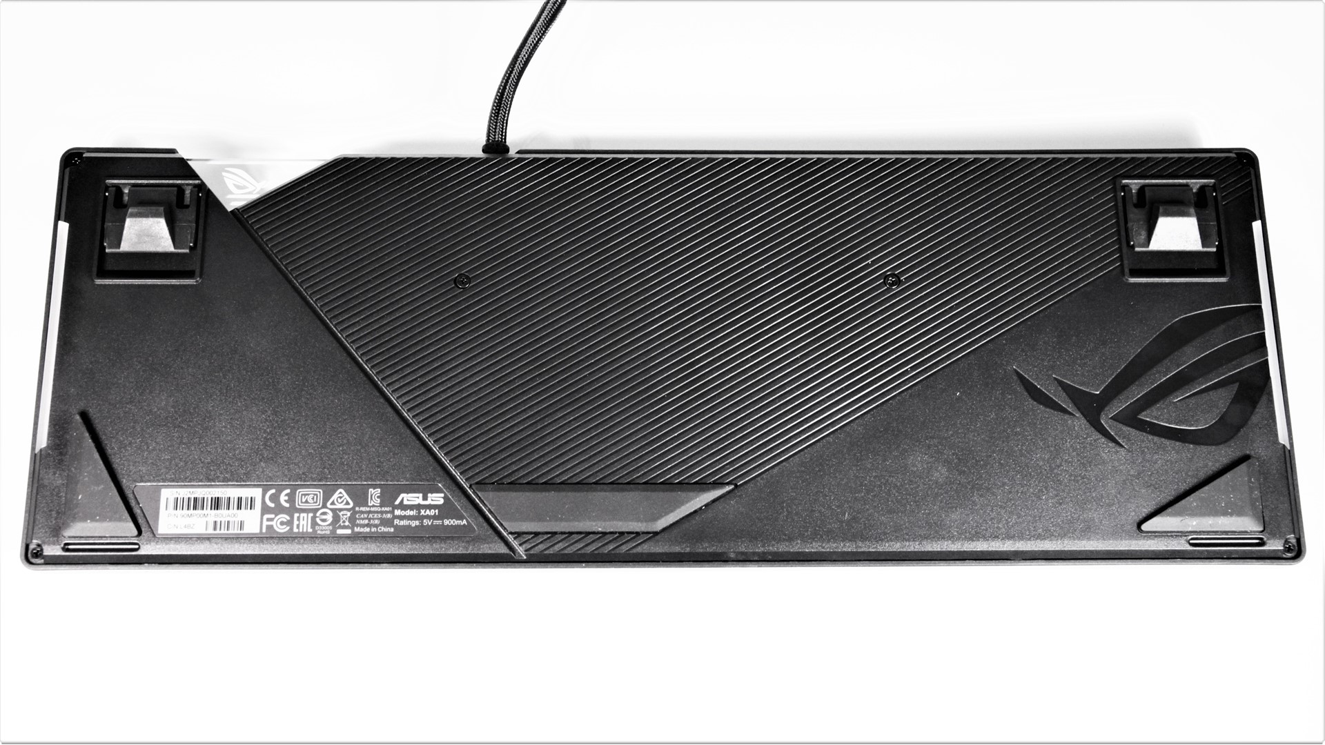 Tastatura aduce trei sprijinuri de cauciuc în parte inferioară, iar mai sus avem picioarele rabatabile, acoperite și ele cu același tip de cauciuc. Chiar și cu acestea rabatate, tastatura ASUS ROG Strix Flare are o poziție ușor oblică, nu este așezată perfect plat pe suprafața de contact.