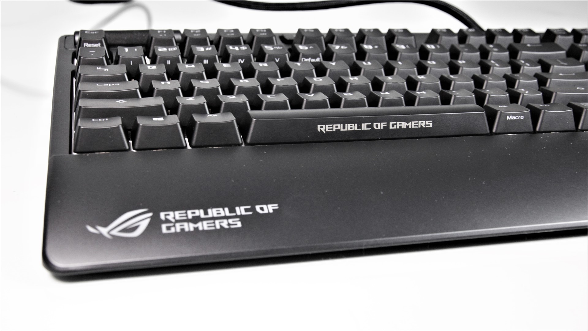 Layout-ul tastaturii ASUS ROG Strix Flare primite de noi a fost unul QWERTY, standard US. Fonturile de pe fiecare buton le-am găsit un pic ciudate, fiind asemănătoare cu cele folosite și în scrierea brandului Republic Of Gamers.
