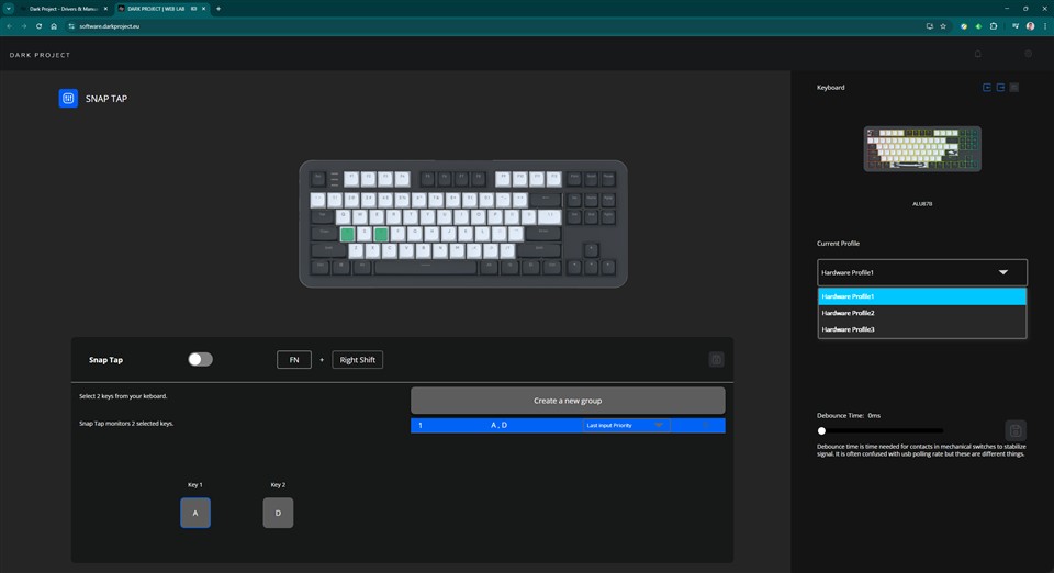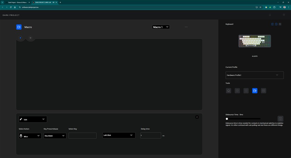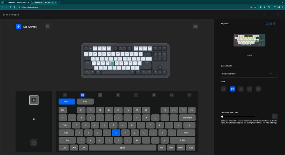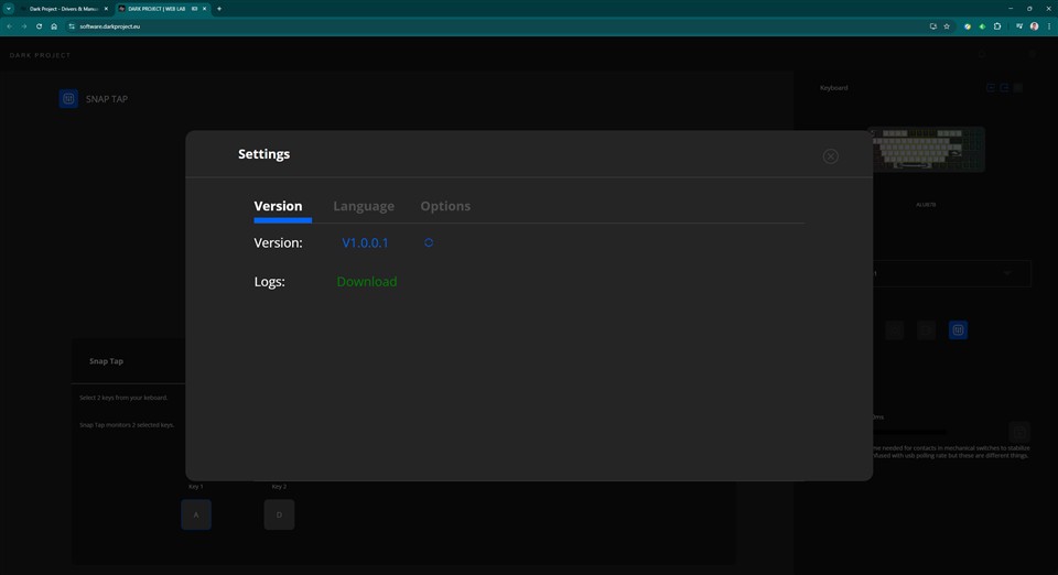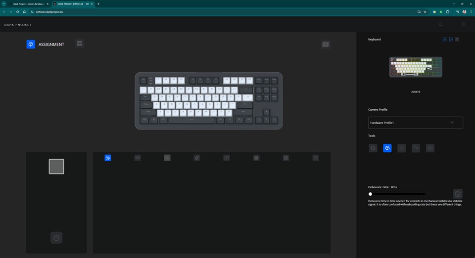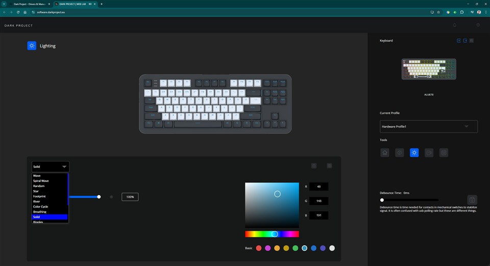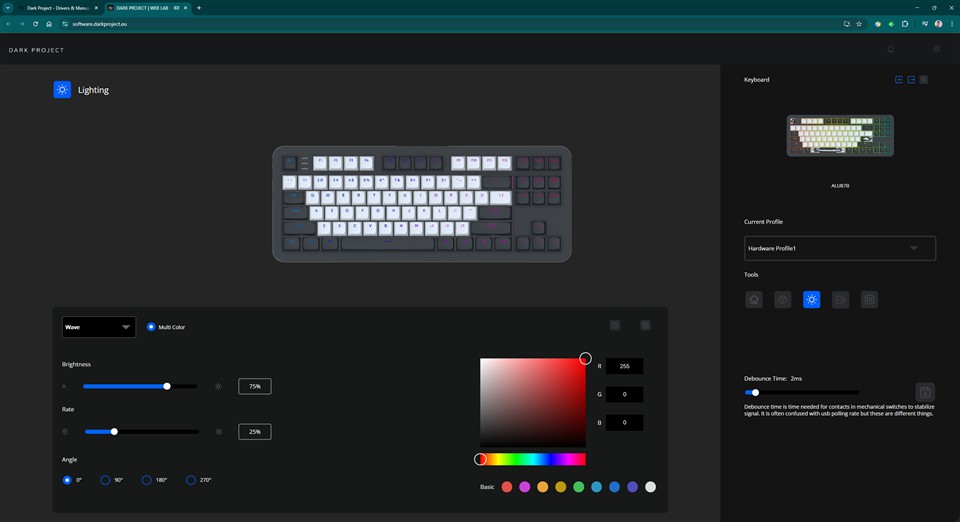 Dark Project Bushido pornește și este recunoscută automat de Windows, în cazul meu versiunea 11 Pro. Iluminarea poate pornită / oprită prin combinația Function + Esc, iar intensitatea acesteia se reglează în patru trepte prin combinația Function + săgeată sus, respectiv săgeată jos. Pentru a avea acces la toate setările și pentru a personaliza în detaliu tastatura, cu tot ce permite (și permite multe), este nevoie să accesezi site-ul oficial, mai departe secțiunea Drivers & Manuals, pentru ca apoi să selectezi din dreptul tastaturii Dark Project Bushido opțiunea Web Software. Astfel, nu este nevoie să instalezi nimic local pe PC-ul tău, ci vei parcurge întreaga interfață a aplicației dedicate acestei tastaturi direct din browser.