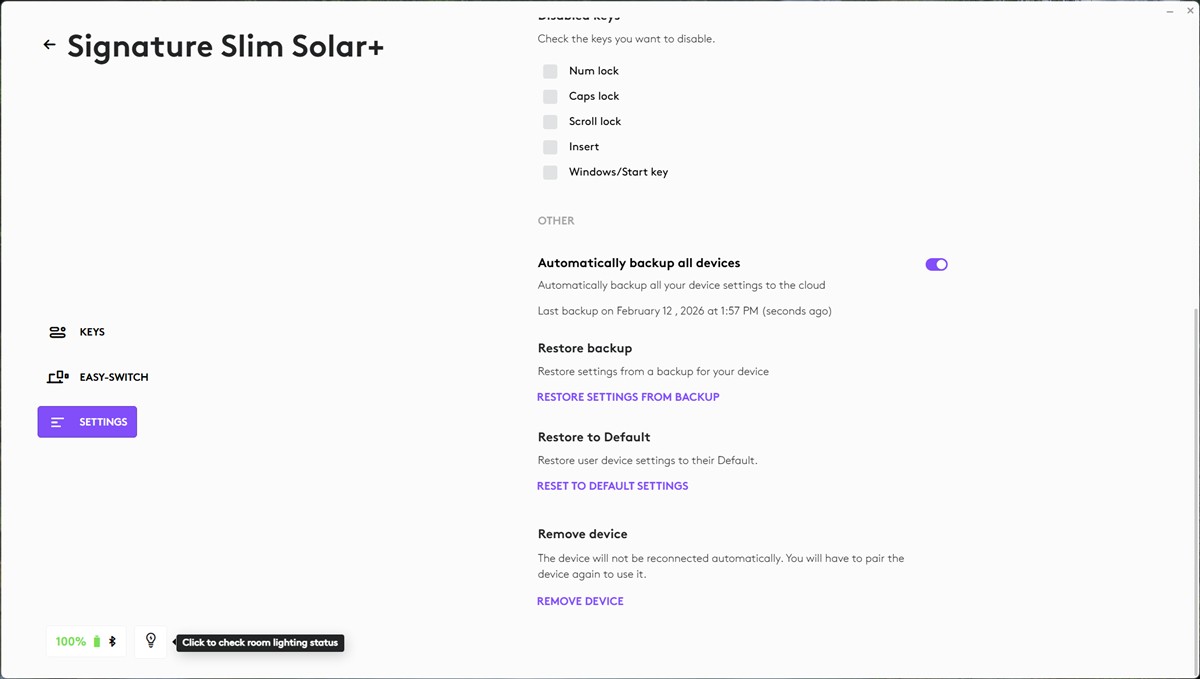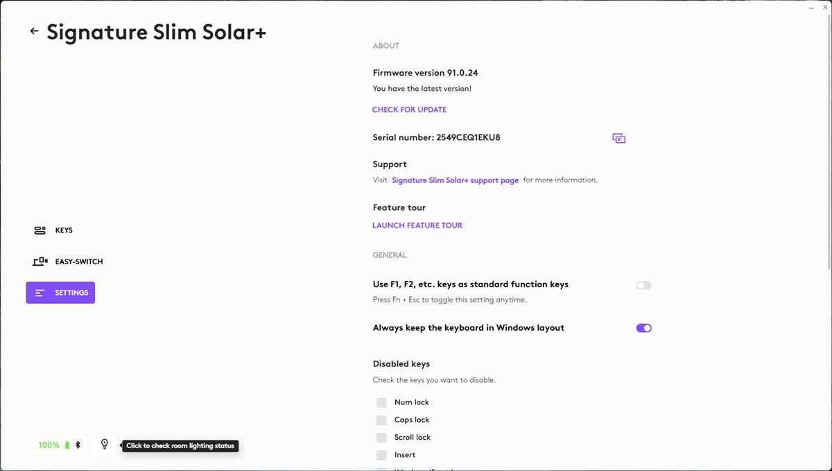 La mine, în condițiile în care monitorul OLED de 32 inch este în fața tastaturii și cu lumina aprinsă în cameră, funcția „Check room lighting status” îmi arată că nu este suficientă lumină. Doar că, în cele peste 10 zile de când tastatura este acolo niciodată nu am văzut altceva în afară de 100% în dreptul bateriei integrate.