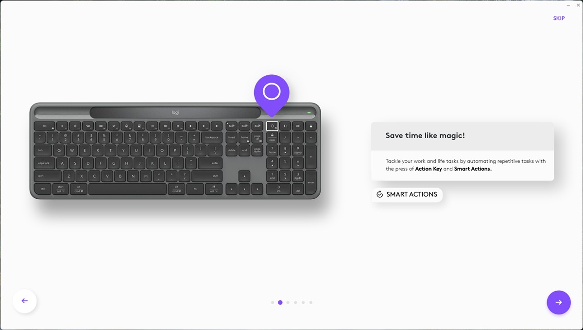 Cea mai interesantă funcție, care este fără discuție un ajutor imens în fluxul de lucru care presupune anumite sarcini repetitive sau cele prin care treci zilnic de la unele la altele, este Smart Actions. Practic, este o zonă unde setezi anumite taste să execute anumite sarcini. Poți simplu să setezi să deschizi o anumită aplicație, oricare dintre cele de pe PC-ul tău, dar poți face mult mai mult de atât. De exemplu, eu am încercat să folosesc tasta de „Brightness down” pentru a scrie automat „Bună ziua”. Salvezi acest profil și apoi de fiecare dată când apeși acea tastă în document, mail, pe WhatsApp sau oriunde ai nevoie va fi scris automat „Bună ziua”. Este un simplu exemplu, dar poți face mult mai multe cu Smart Actions, lucruri care să-ți ușureze enorm munca.
