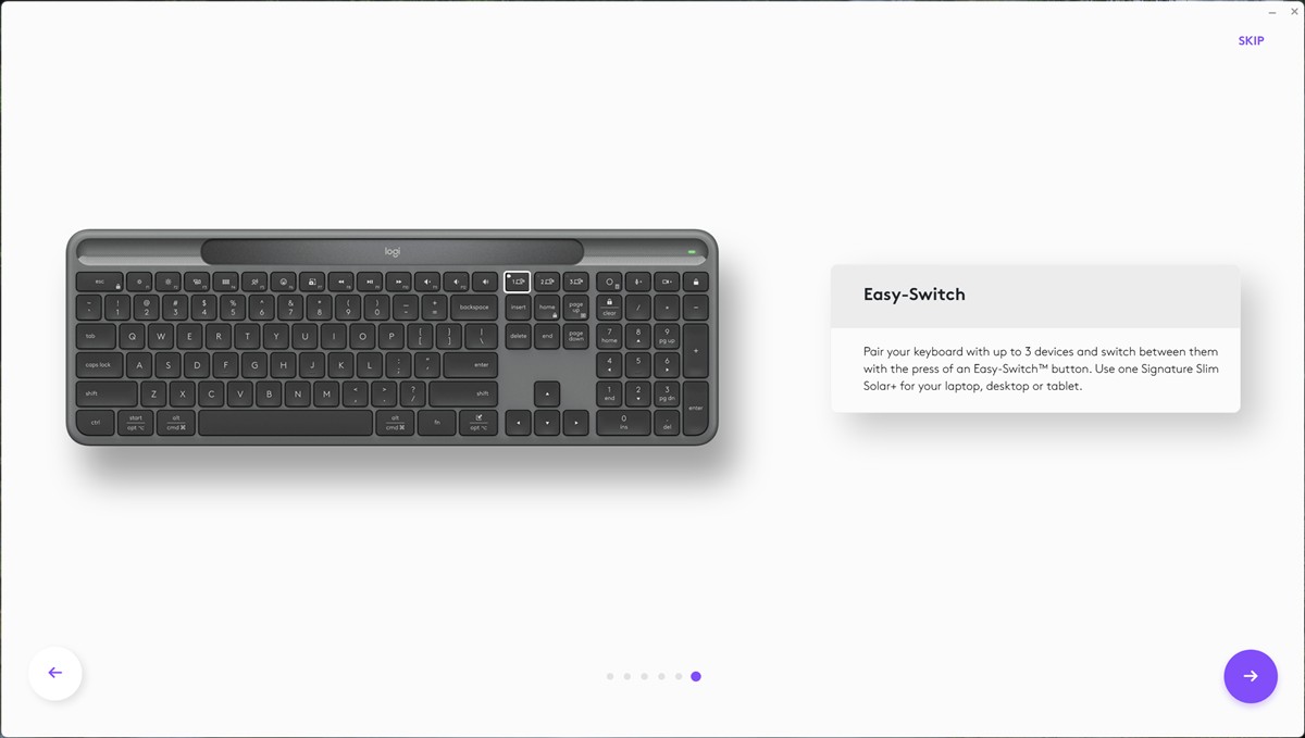 Încep aici direct cu Easy-Switch, care permite conectarea să-i spune simultană la până la trei dispozitive. Acestea pot fi PC-uri cu Windows, Mac-uri, iPad-uri, Chromebook-uri ori device-uri Android. Ideea este că de fapt aceste trei dispozitive nu sunt conectate simultan, ci pre conectate, să spunem. Adică, împerechezi câte un dispozitiv separat pe care îl aloci pentru câte una dintre tastele Easy-Switch. Apoi, doar apeși una dintre acele taste și Logitech Signature Slim Solar+ se conectează instant la acel dispozitiv atribuit.