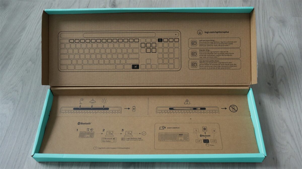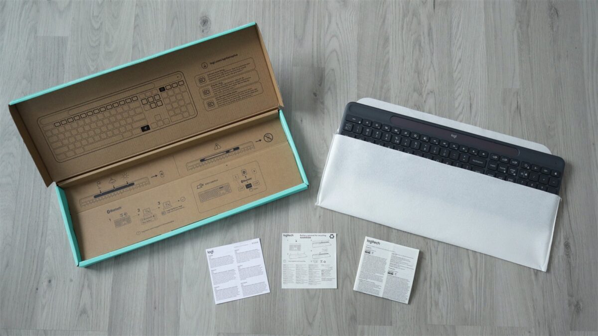 La mine, exemplarul de test a ajuns în culoarea Graphite (un gri închis), mai există și pe alb, dar este versiunea de macOS. Cutia era sigilată, iar înăuntru tastatura este pusă într-o „husă” din hârtie reciclată, mai jos fiind trei pliante cu fel de fel de informații, însă niciunul cu rol de ghid de pornire rapidă. Astfel de informații sunt afișate pe interiorul cutiei, mai puțin ca text și mai mult prin grafică sugestivă.