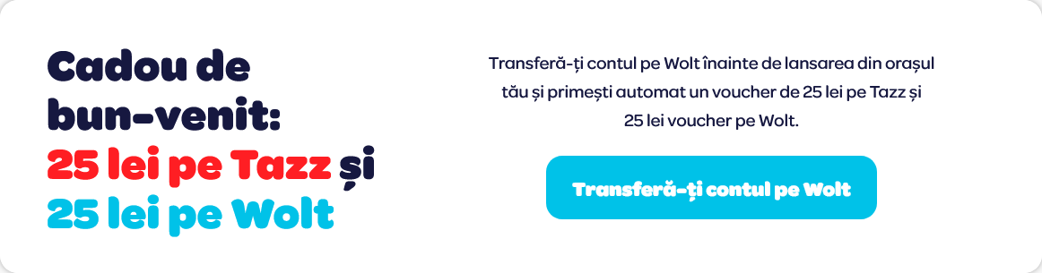 Şi pentru că utilizatorii sunt cei mai importanţi, aceştia primesc şi vouchere de bun-venit (două mai exact, ambele a câte 25 de lei fiecare). Tot ce trebuie să faci pentru a beneficia de ele este să îţi transferi contul de pe Tazz, pe Wolt. Atât de simplu.