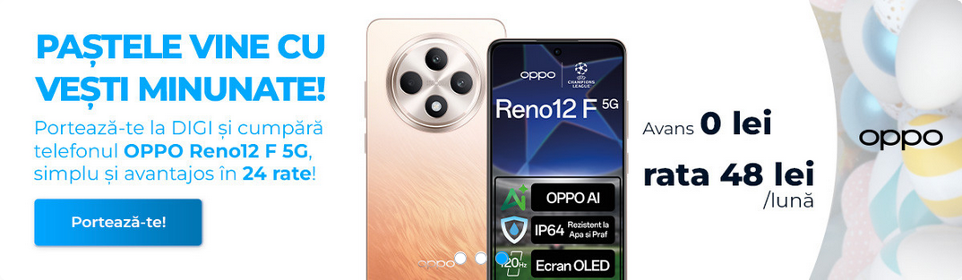 - Portare abonament către un pachet Digi Optim / Nelimitat – 0 lei avans şi 24 rate x 50 lei / lună.