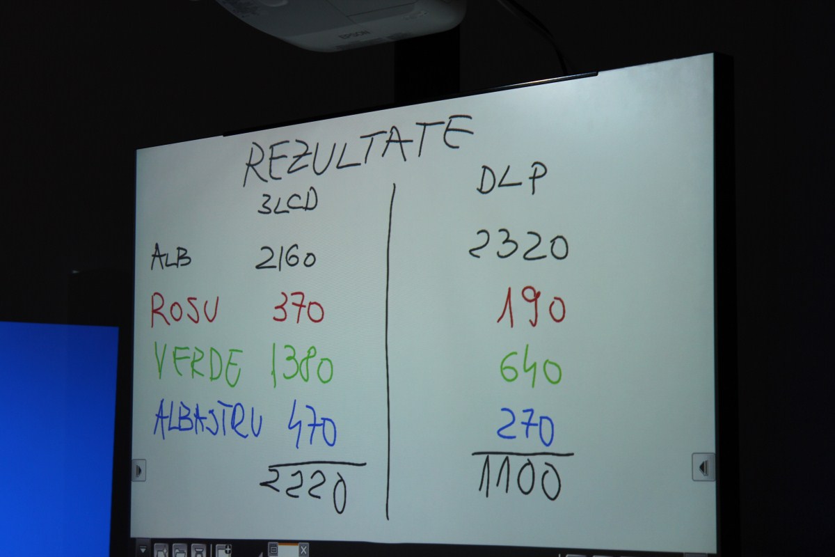 DLP-ul a ieșit puțin mai bine în ce privește luminozitatea pe alb, dar pierde drastic la luminozitatea pe culoare, 2x pentru 3LCD.