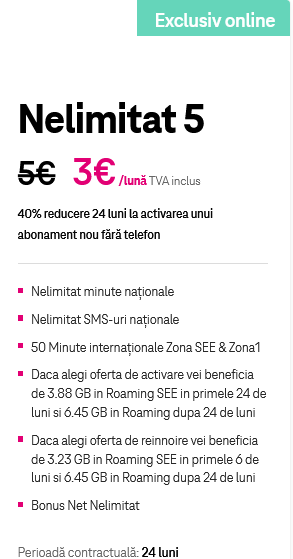 Abonamentul Nelimitat 5 este chiar interesant, acesta având un cost de doar 3 euro / lună (adică undeva la 15 lei, cât o cafea mai răsărită). Pentru aceşti bani primeşti: