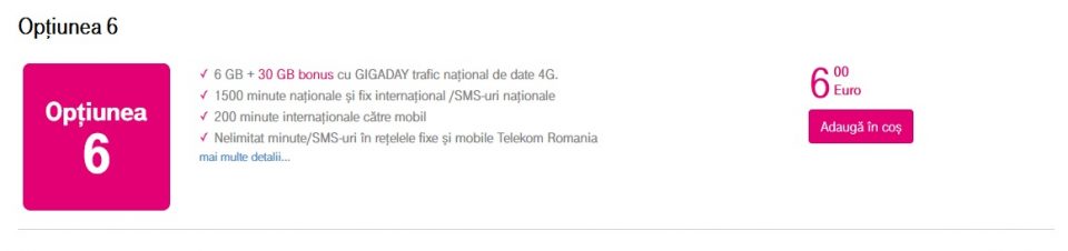 - 6 GB internet 4G + 30 GB bonus cu GIGADAY (1 GB în fiecare zi);