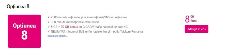 - 8 GB internet 4G + 30 GB bonus cu GIGADAY (1 GB în fiecare zi);