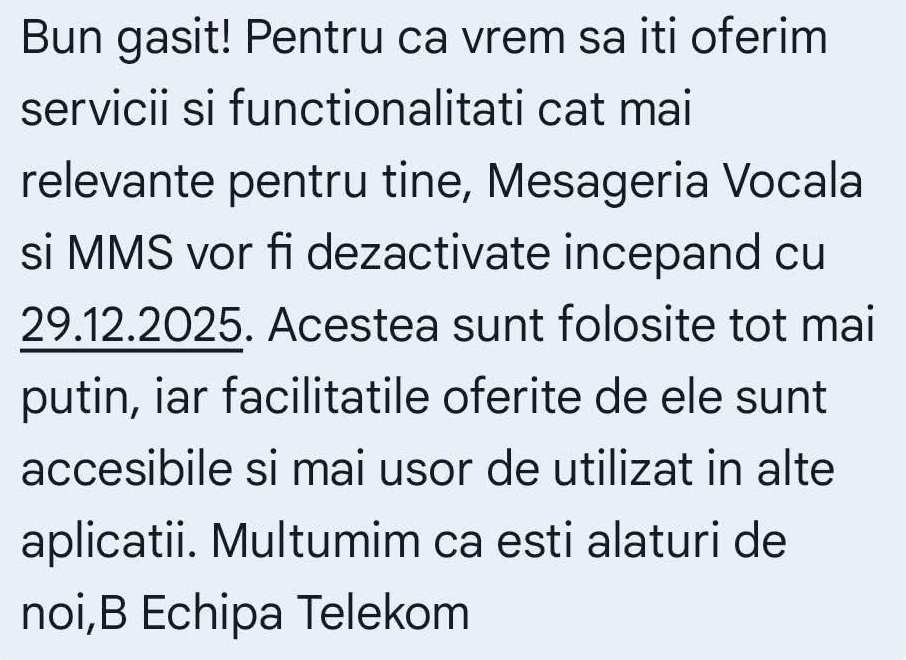 „Bun găsit! Pentru că vrem să îţi oferim servicii şi funcţionalităţi cât mai relevante pentru tine, Mesageria Vocală şi MMS vor fi dezactivate începând cu 29.12.2025. Acestea sunt folosite tot mai puţin, iar facilităţile oferite de ele sunt accesibile şi mai uşor de utilizat în alte aplicaţii. Mulţumim că eşti alături de noi, Echipa Telekom.” se arată în mesajul transmis clienţilor.