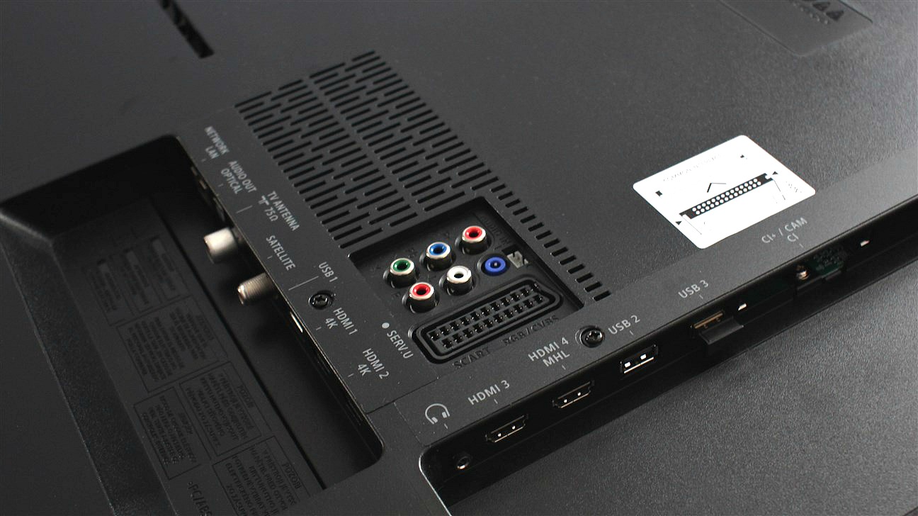 Prin fir, avem rețea LAN prin RJ-45, 4 x HDMI, dintre care 2 pentru conținut 4K, 3 x USB, ieșire audio optică, audio in composite, jack de 3.5 mm, 1 x SCART, intrare composite YPbPr, dar și mufele clasice pentru cablu TV și satelit.