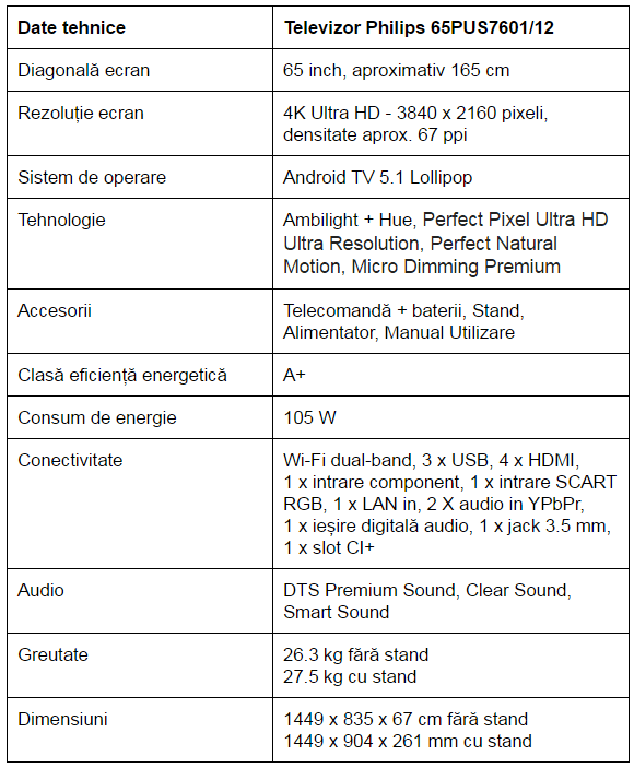 Philips 65PUS7601/12 – preț mediu în piață circa 9500 de lei, momentan nu mai apare în oferta eMAG.