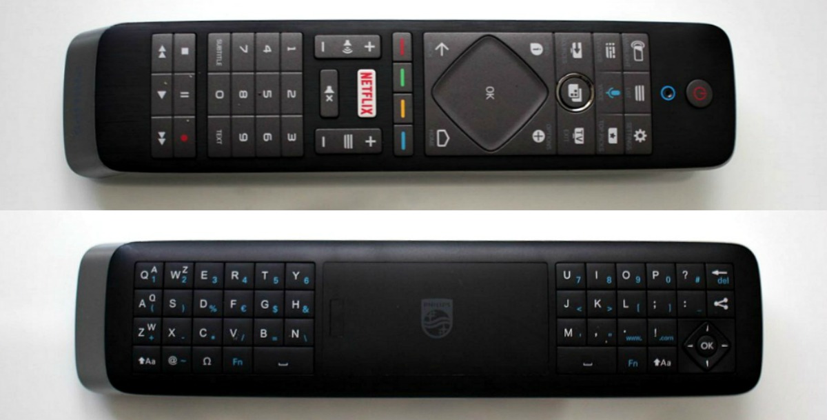 Este o telecomandă cu două fețe. La propriu. Cea principală arată ca o telecomandă clasică, cu toate că avem câteva butoane ce ne amintesc că suntem la comanda unui Smart TV. Avem tastă shortcut către Netflix, iar butoanele direcționale acționează și ca zonă capacitivă. Putem așadar fie apăsa săgețile pentru navigare, fie să facem swipe stânga-dreapta sau sus-jos pentru a ajunge mai repede unde dorim. Cu swipe este mai greu să fii exact, căci uneori treci de meniul unde voiai să ajungi. Cu ceva antrenament te obișnuiești și ajungi să mânuiești la fix telecomanda.