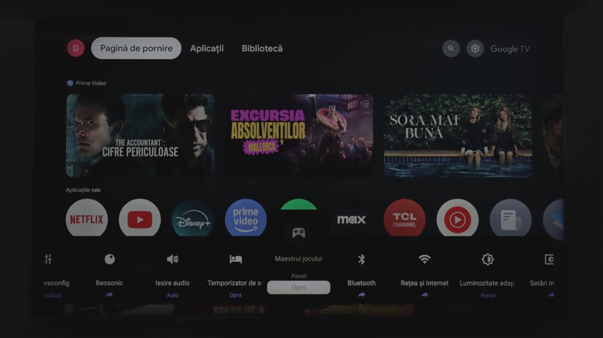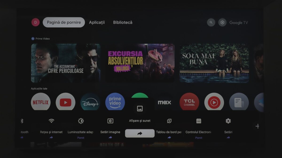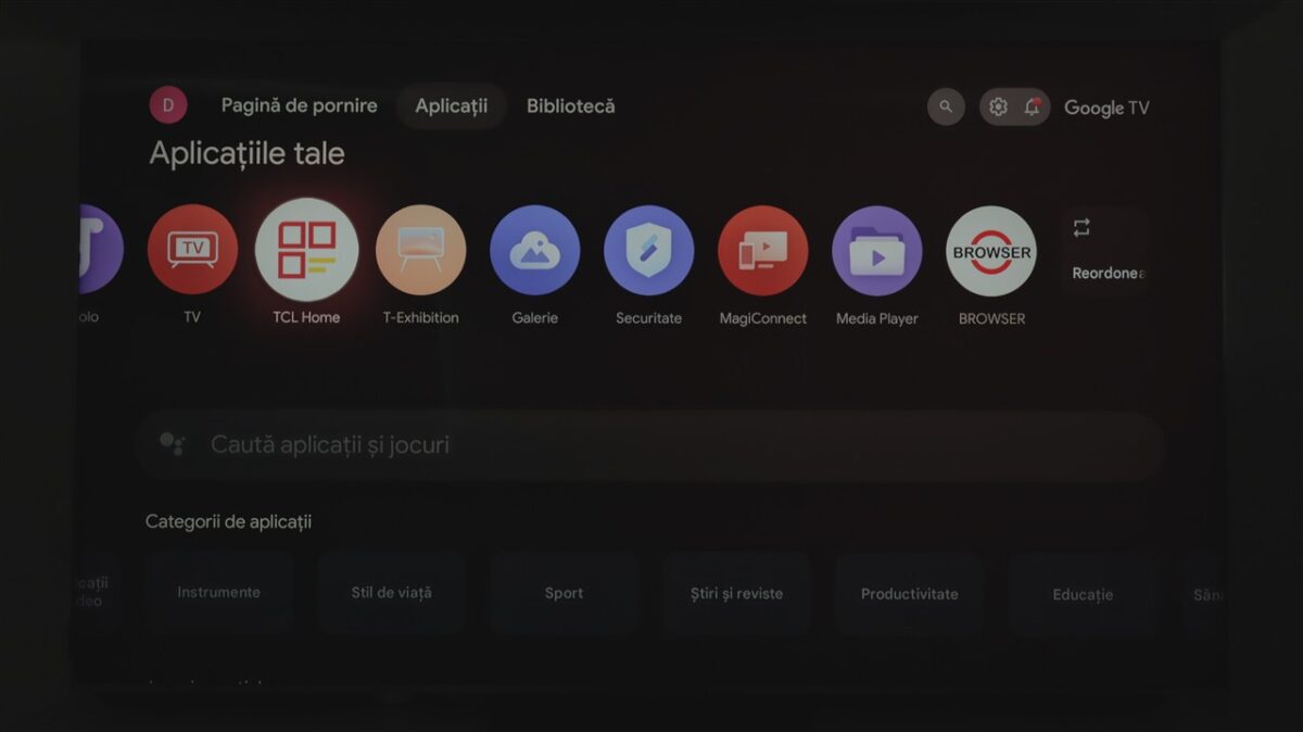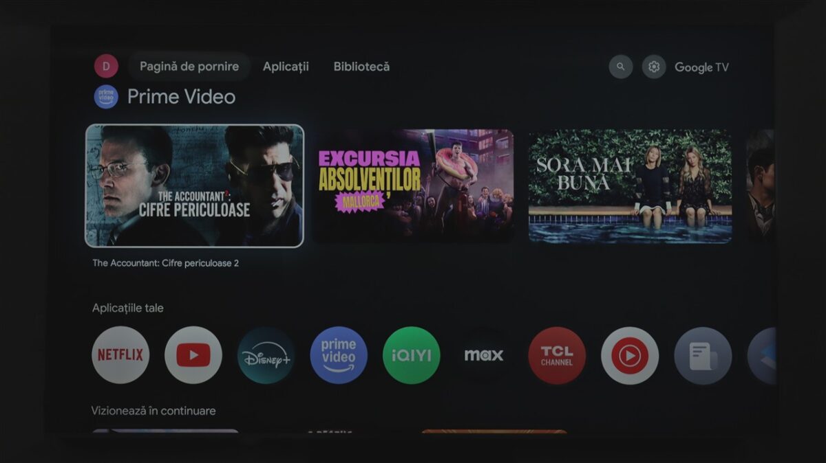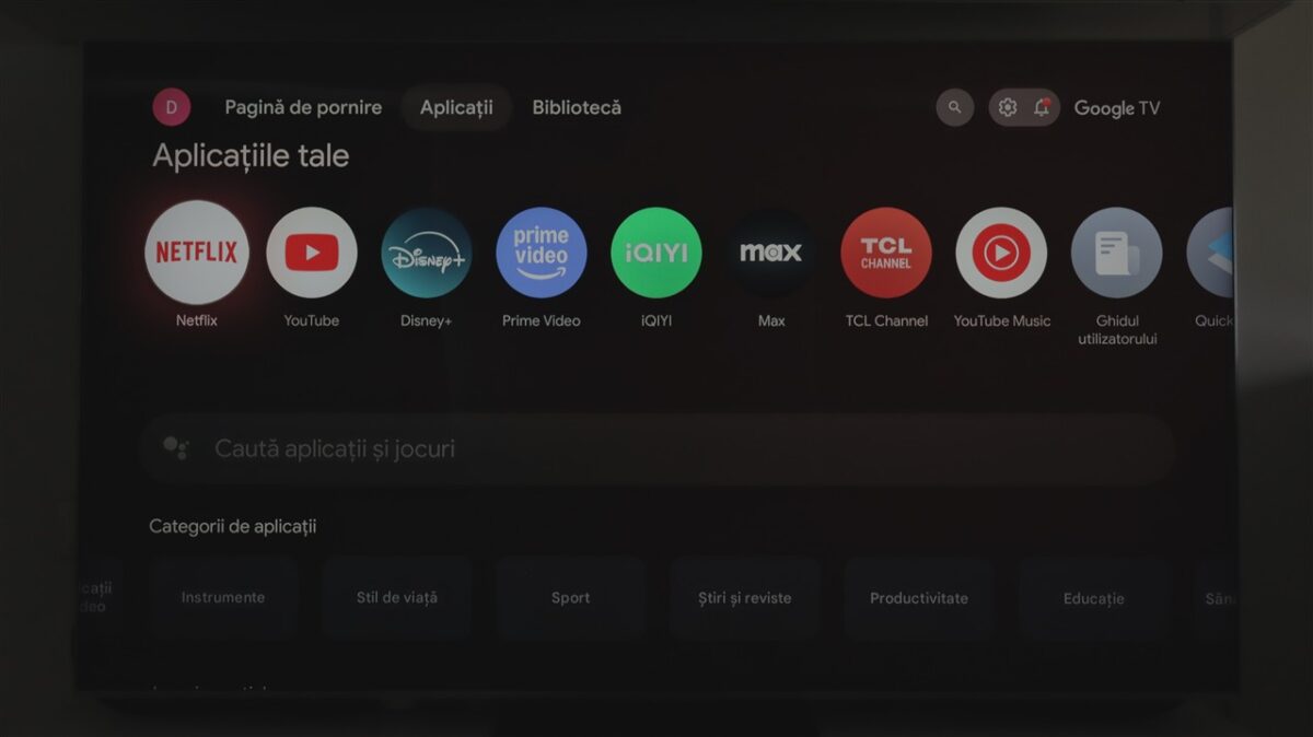 Sistemul de operare este Google TV 12, care este o idee diferit față de ce știam de la ediția 11. Acum mi se pare mai light, mai aerisit, cel puțin pe pagina Home. Oricum, nu există șansa de a nu te descurca pe TCL 65C9K cu acest sistem de operare, care oferă și ceva posibilități de personalizare, cu aducerea celor mai folosite aplicații între primele din listă.