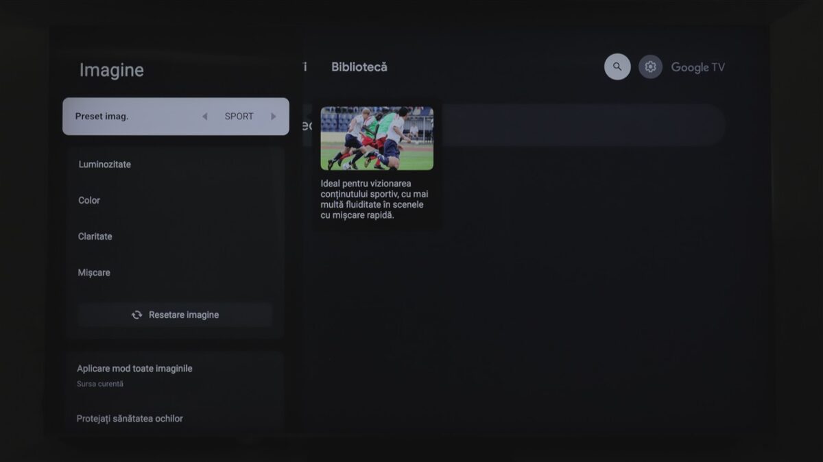 După ce am încheiat configurarea inițială, am parcurs câteva programe TV. Am fost întâmpinat cu niște culori extrem de aprinse, de vivide, de saturate. Din fabrică așa sunt setate culorile, iar contrastul este uriaș, la fel ca și luminozitatea. Cumva, TCL 65C9K vrea să te uimească din prima prin tot ce poate. Doar că exagerează un pic (mai mult), dar asta doar pe modurile Standard, Dinamic, Sport și Inteligent. Sunt diferențe evidente între fiecare, dar toate patru vor să te dea pe spate prin luminozitate, contrast și culori saturate.