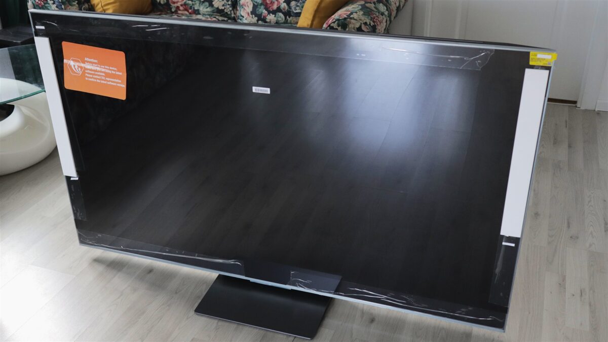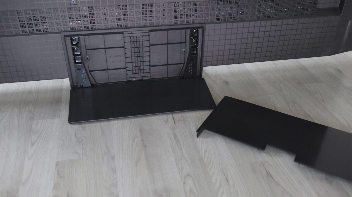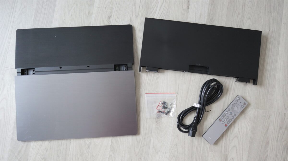 La mine a ajuns un exemplar de test, care însă pare a fi întocmai precum cele de retail. În cutie eu am mai găsit, pe lângă televizorul bine fixat și protejat (inclusiv cu multe folii și mici fâșii de burete), cele două elemente care compun ulterior standul central, șuruburi pentru montarea acestora, un capac din plastic pentru stand, telecomanda și cablu de alimentare. Foarte probabil, unitățile destinate comercializării vor avea în cutie și baterii pentru telecomandă, dar și un manual de utilizare sau măcar un ghid de pornire rapidă.