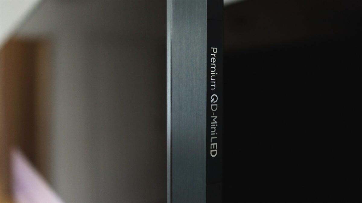Ca elemente mai speciale de design pot aminti denumirea producătorului de pe centru, precum și inscripțiile „Audio by BANG & OLUFSEN” (frontal, în colțul dreapta jos) și „Premium QD-MiniLED” (pe laterala din dreapta, sus).