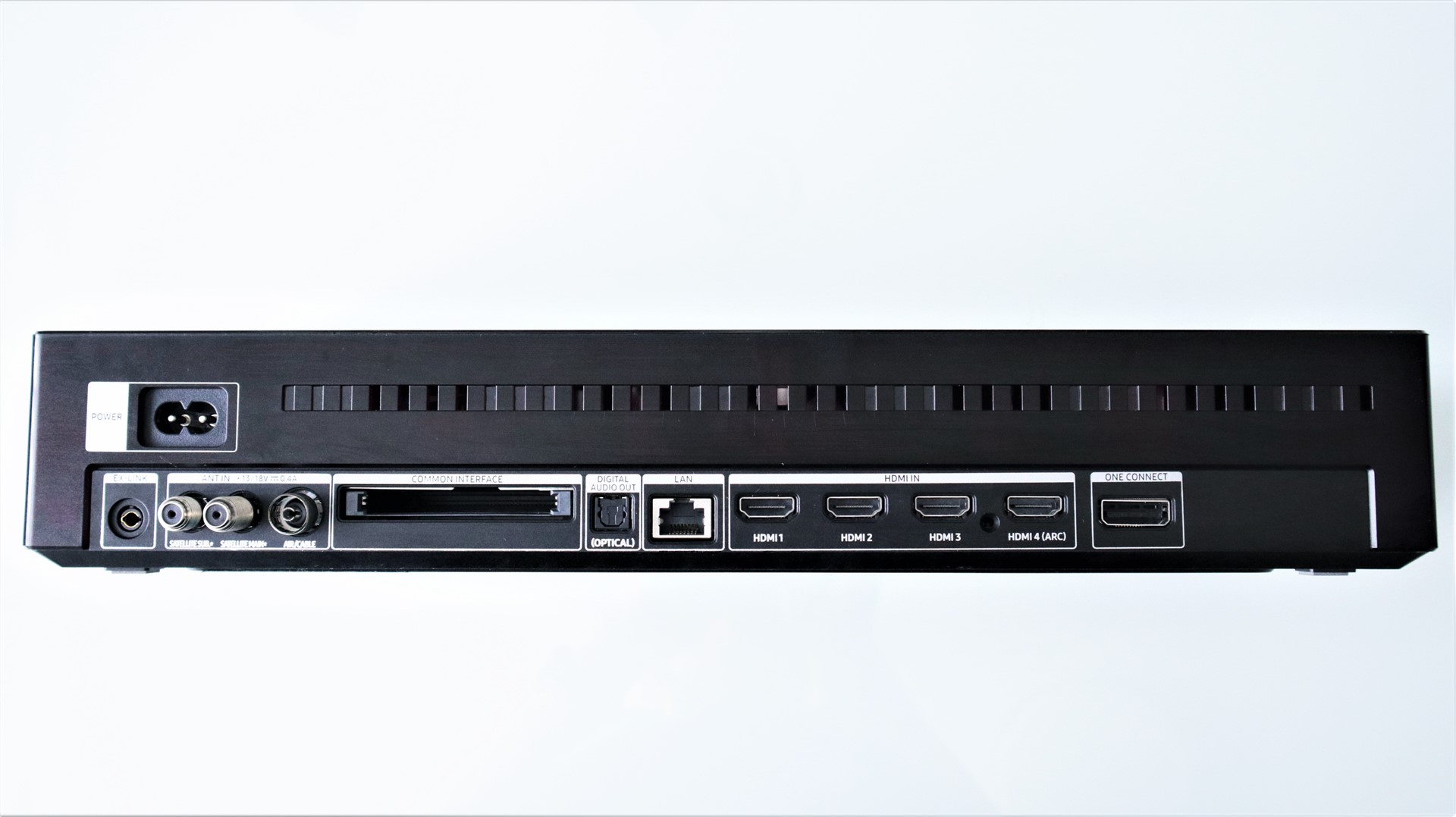 Alt atu pentru Samsung QE65Q9FNAT este dat de modulul de conectivitate One Connect Box. Acesta permite ca din televizor să iasă un singur cablu, ce se ocupă inclusiv de alimentarea cu energie electrică a acestuia. Cablul de curent intră doar în One Connect Box.
