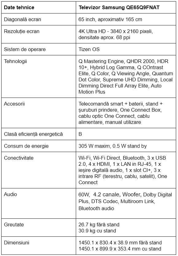 Samsung QE65Q9FNAT a ajuns la noi în cutia de retail, una extrem de mare și de grea, pachetul având peste 40 de kg. Așa că pentru a desface și monta acest televizor este în mod clar nevoie de două persoane. În cutie am găsit televizorul, standul alcătuit din două piese, șuruburi pentru a monta standul, telecomanda cu baterii compatibile, One Connect Box, cablul unic pentru conectare One Connect Box și televizor, cablul de alimentare și manual de utilizare.