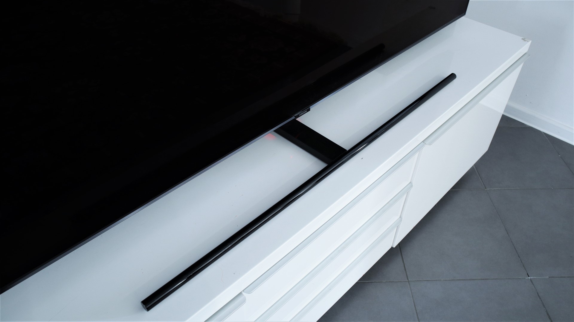 Un alt aspect de apreciat la telecomandă este acela că se conectează prin Bluetooth la modulul One Connect Box. De ce este asta de apreciat? Fiindcă astfel modulul nu trebuie să preia semnal IR ca în cazul telecomenzilor convenționale, deci poate fi ascuns într-un sertar sau un raft cu ușă, ascuns vederii.