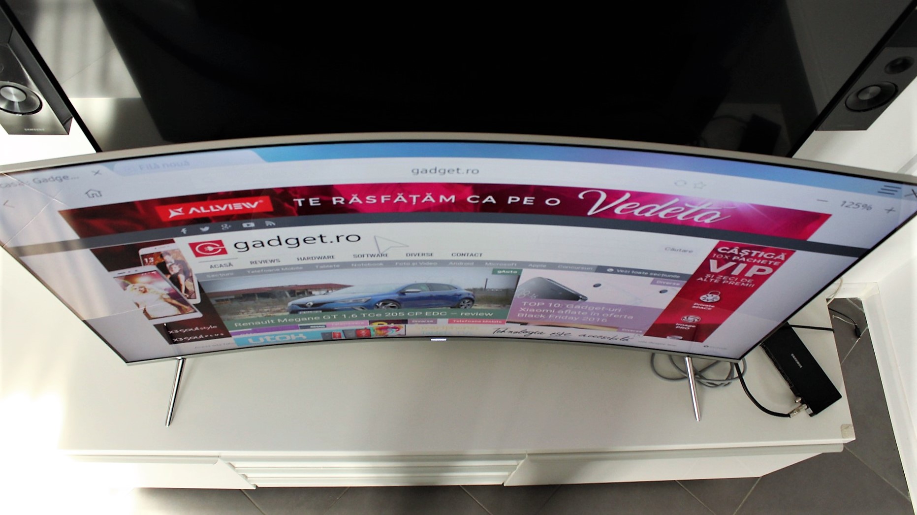 Trecem la ecranul curbat al lui Samsung UE49KS7502. În primul rând o să vă spun că acesta reflectă ceva cam pronunțat mediul ambiant și, mai mult, tocmai din cauză că este curbat, va reflecta lumina ambientală și din unghiuri din care un display plat nu o va face. Asta deranjează destul de tare dacă ai poziționat televizorul cu fața către ferestre, ca în cazul meu. Desigur, noaptea sau cu draperiile trase nu sunt probleme.