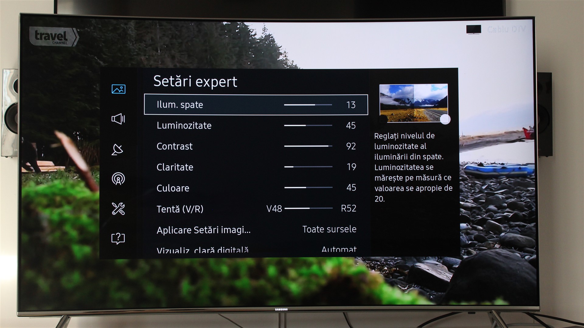Ce trebuie să știți este că Samsung UE49KS7502 poate fi reglat în profunzime, însă asta necesită multe, multe ore de setări. Eu am făcut trecerea mereu între modul PC, cu televizorul legat la laptop, unde setările de imagine erau salvate în Windows, și modul TV. Astfel încercam să ajung la aceeași calitate precum cea oferită prin laptop, deci cea reglată de un software și un dispozitiv profesionale.