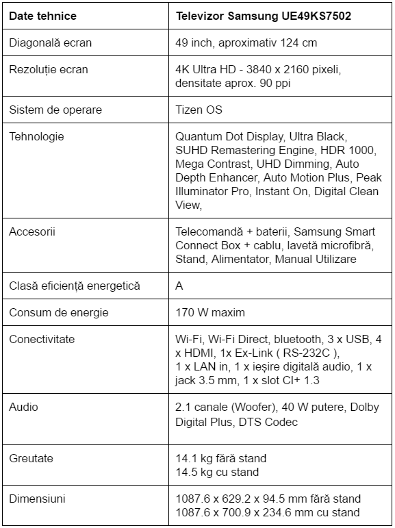 Acum nu cred că ar trebui să mă vait din astfel de motive, mai ales că de data aceasta vorbim despre un model ceva mai accesibil ca și cost de comercializare. Nu vă așteptați totuși la un chilipir, fiindcă avem până la urmă multe tehnologii încorporate, doar particula SUHD ar trebui să spună destule. Pe lângă asta, puteți vedea în tabelul de mai jos cu ce vine la pachet un Samsung UE49KS7502.